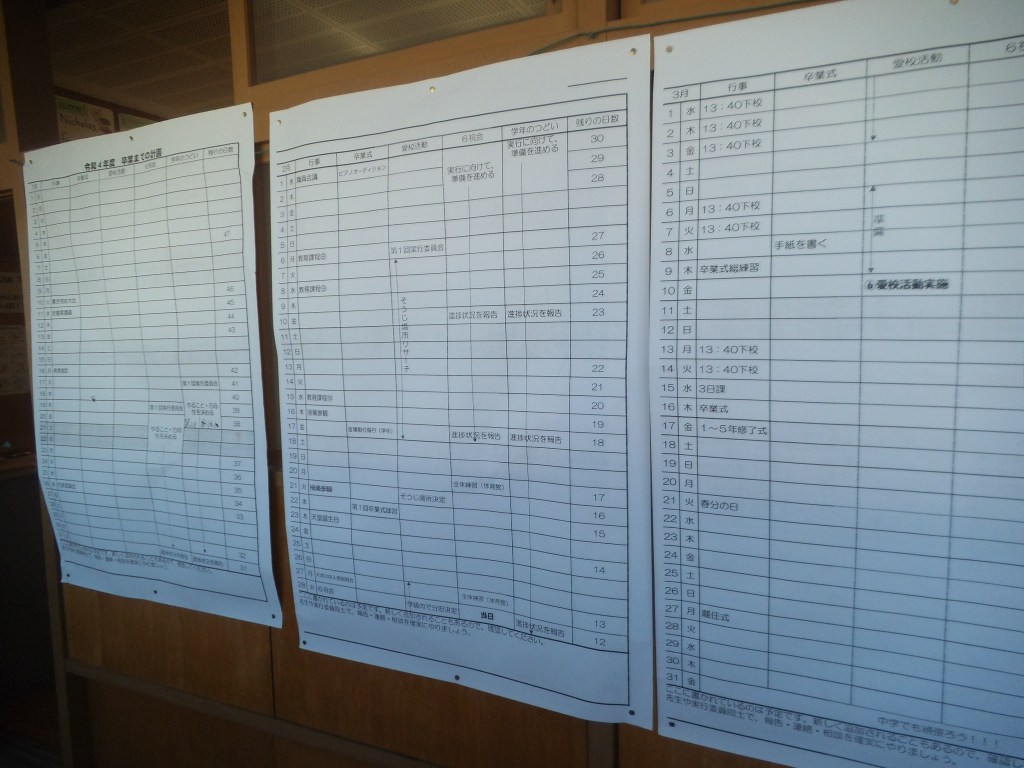 今朝、ブランコのところで1年生が「氷がはっているよ」と教えてくれました。寒い中ですがまぶしい朝日を背に持久走の練習をする1年生の姿もありました。その持久走をするために毎朝、体育委員会の子どもたちが運動場にコーンを並べてくれています。6年生の廊下には卒業までのスケジュールが掲示されていました。卒業までに登校する日は38日。一日を大切にやり残したことがないように過ごしてほしいです。積雪した富士山がそんな子供たちを応援してくれているようでした。