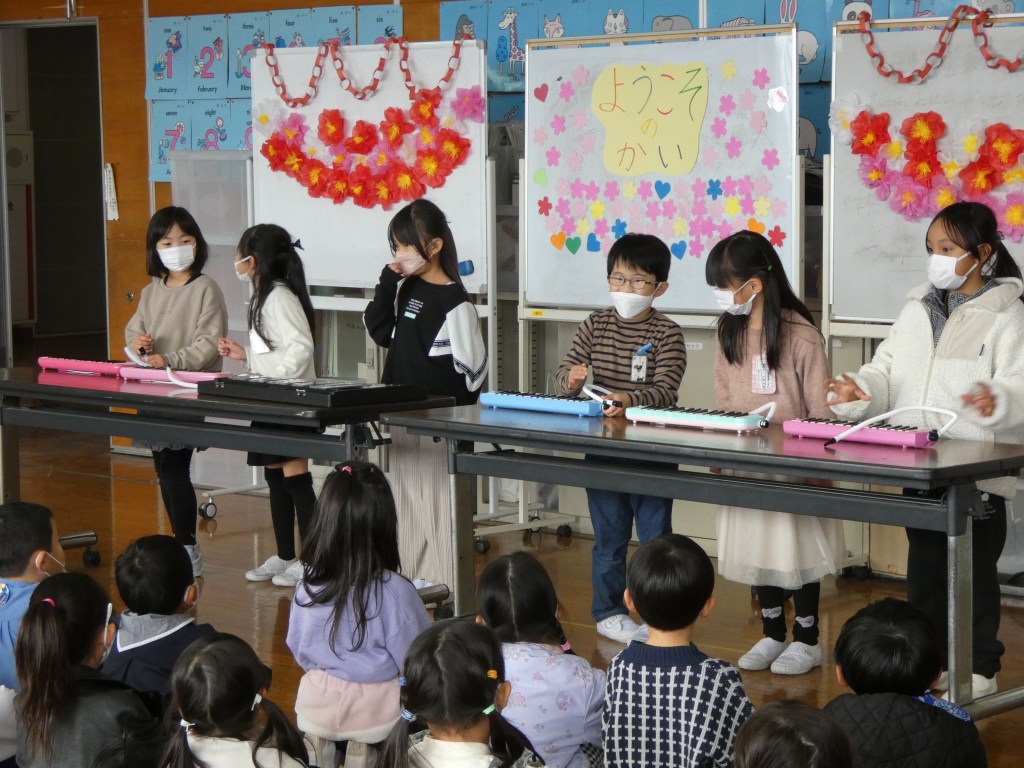 今日はミュージックコンサート4日目、最終日でした。今日は1・2年生と5年生の発表、そしてシークレットゲストとして5年2組鈴木教諭によるギター演奏が行われました。最終日ということもあり、多くの子ども達が演奏を観に集まりました。大盛況の中、本年度のミュージックコンサートは終了しました。
