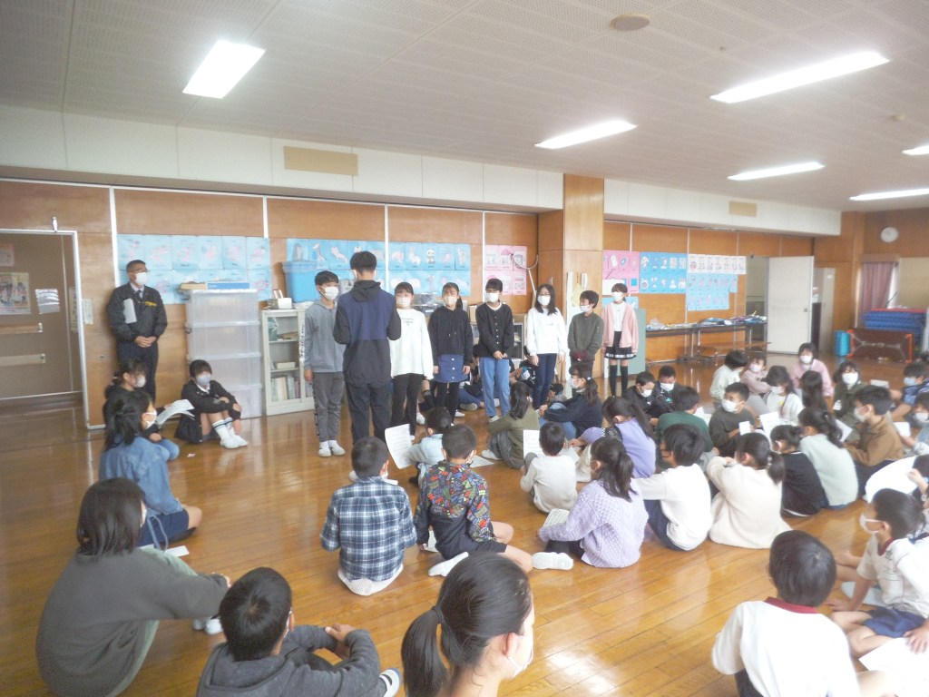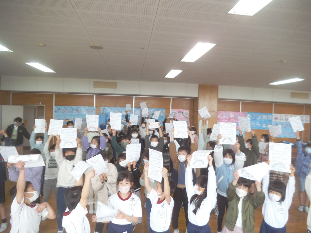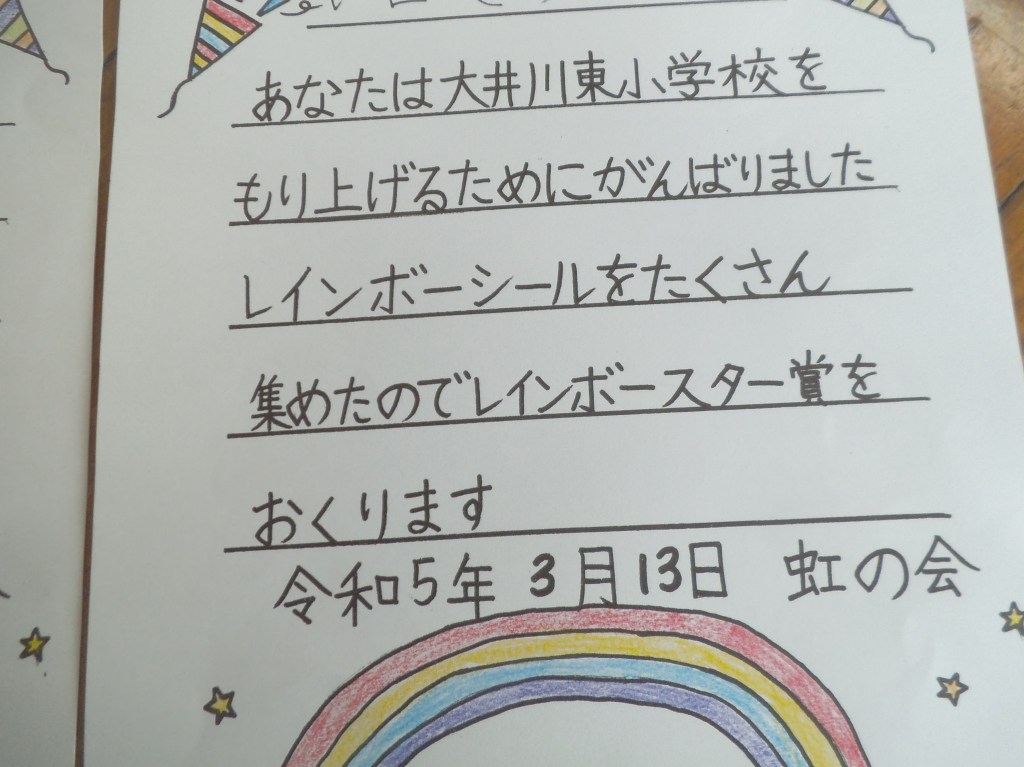 業間休み時間にレインボー賞の表彰がありました。1年間、色んな委員会の活動(あいさつ、ラジオ体操など)などに積極的に参加しレインボーシールを集めた全学年の子どもたちの中から、学級で推薦された子たちがあつまりました。「虹の会」の6年生から手作りの賞状を受け取りとてもうれしそうでした。何にでも進んで取り組み、こつこつ努力してきた成果です。おめでとう!!