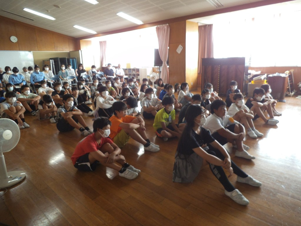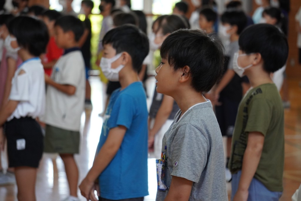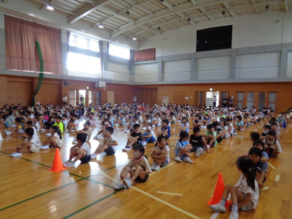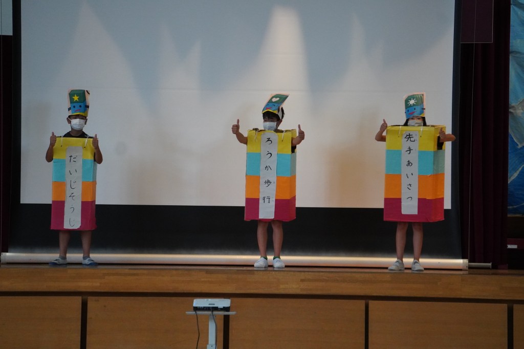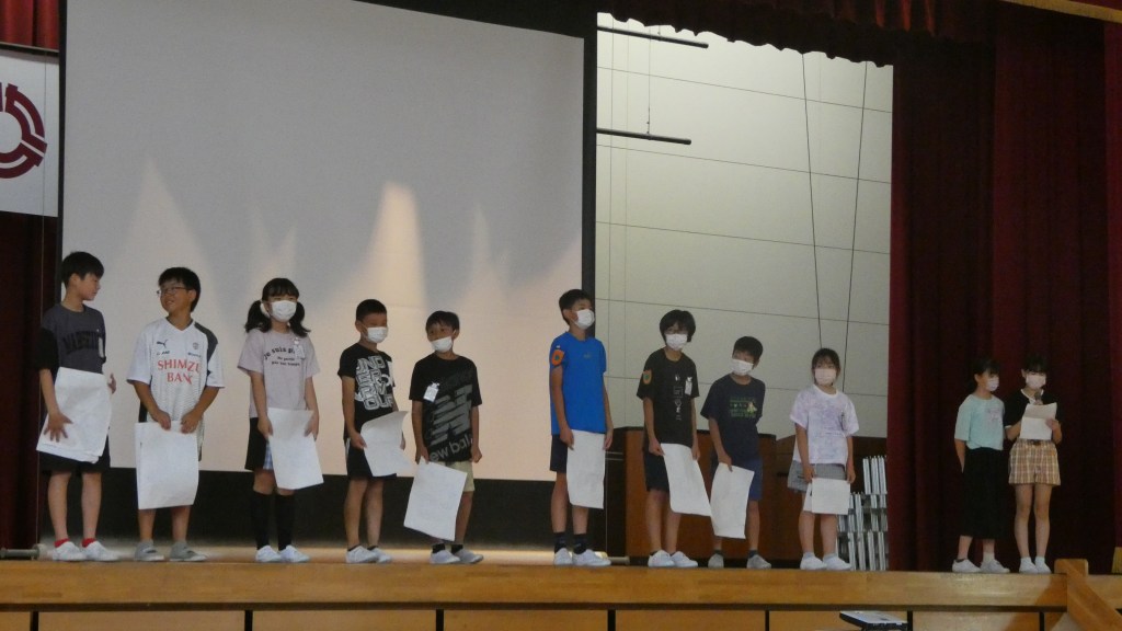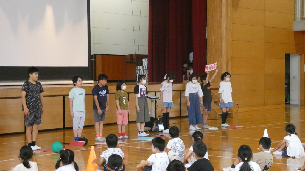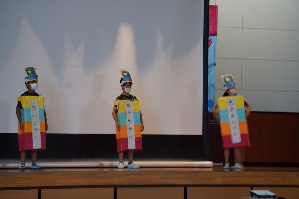 なかよしのステージが終わり、第2ステージ「チャレンジ」が始まりました。つどいでは、ひまわりや朝顔の花が暑くても太陽に向かってかがやくように、ほんの少し難しい目標をもって挑戦し、自分らしくかがやいてほしいという話を聞きました。また、レインボー3兄弟からは体育委員会と生活委員会の話を通して、しずはまっ子によりよい学校になる取組の話がありました。体育委員会からは運動会を通して身に付けた「協力」「努力」「あきらめない心」をこれからも続けようと、生活委員会からは思いやり歩行をするためにおつるちゃんず作戦を行うことです。これからの子供たちの取組が楽しみです。コロナ感染が完全に収束したわけではありませんが、全校で集まること、全員で校歌を歌うよさを改めて感じました。