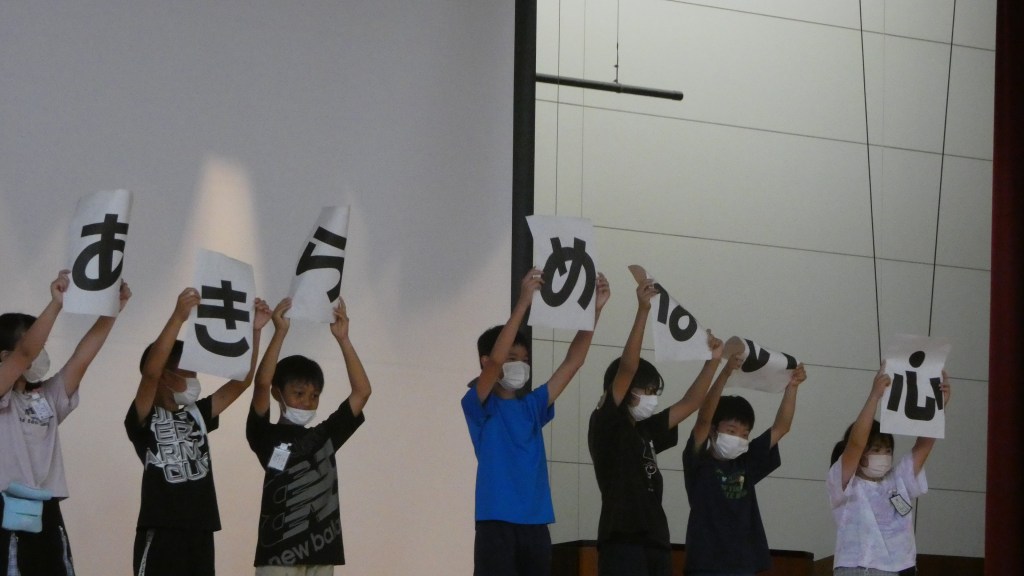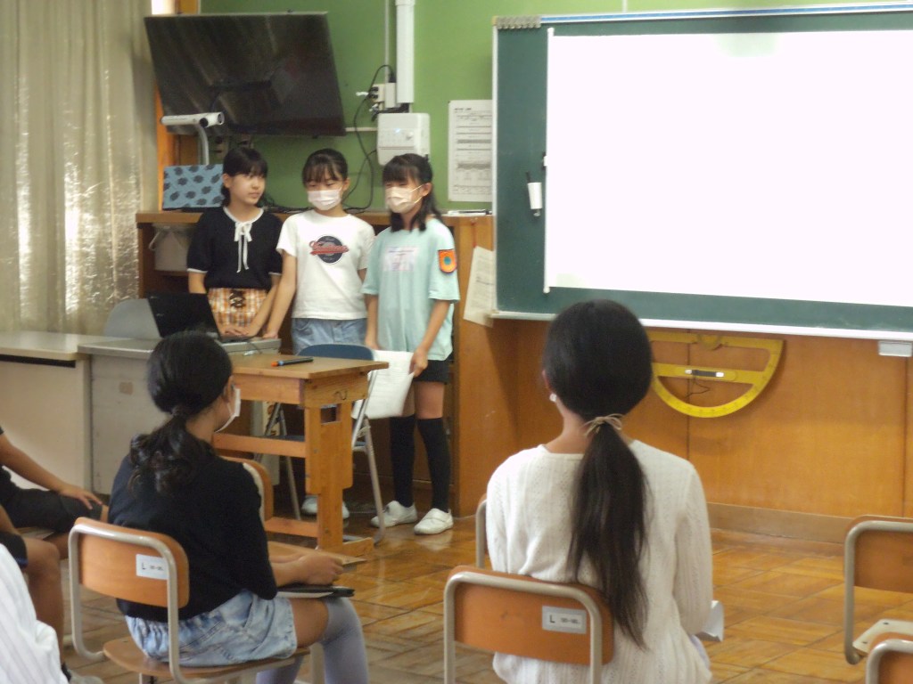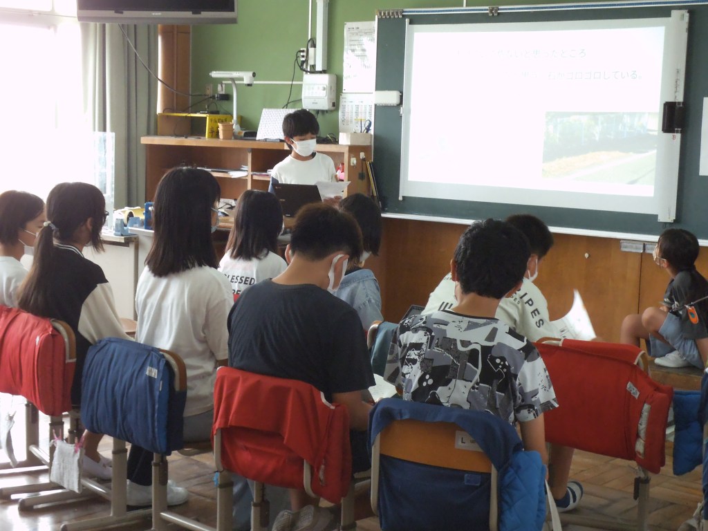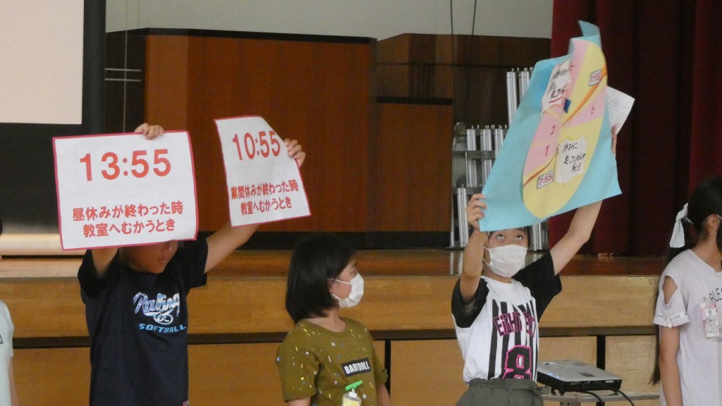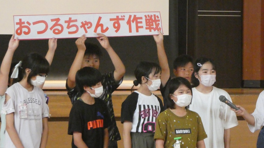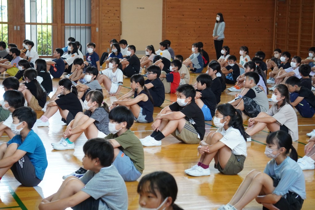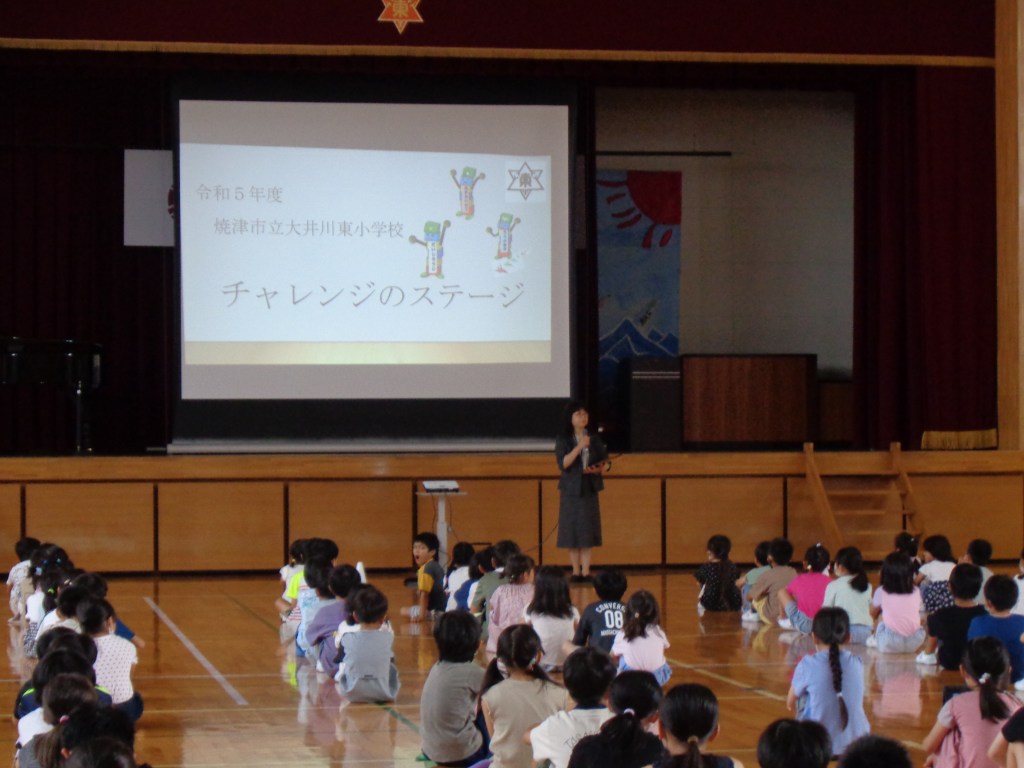 なかよしのステージが終わり、第2ステージ「チャレンジ」が始まりました。つどいでは、ひまわりや朝顔の花が暑くても太陽に向かってかがやくように、ほんの少し難しい目標をもって挑戦し、自分らしくかがやいてほしいという話を聞きました。また、レインボー3兄弟からは体育委員会と生活委員会の話を通して、しずはまっ子によりよい学校になる取組の話がありました。体育委員会からは運動会を通して身に付けた「協力」「努力」「あきらめない心」をこれからも続けようと、生活委員会からは思いやり歩行をするためにおつるちゃんず作戦を行うことです。これからの子供たちの取組が楽しみです。コロナ感染が完全に収束したわけではありませんが、全校で集まること、全員で校歌を歌うよさを改めて感じました。