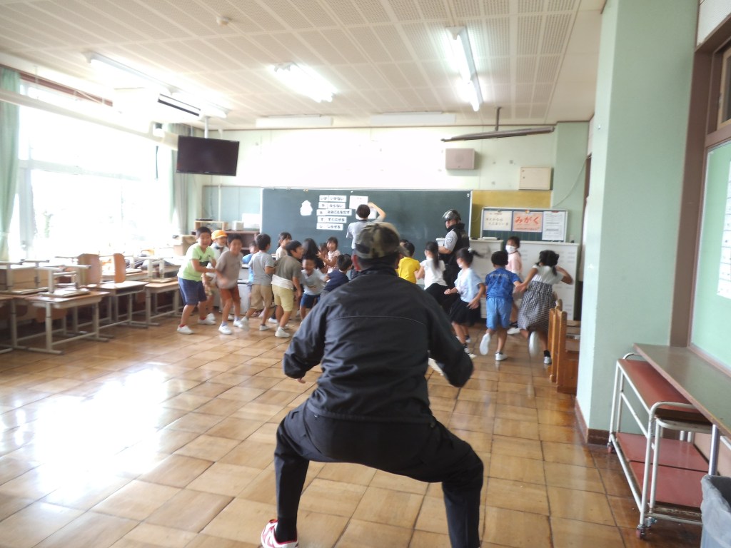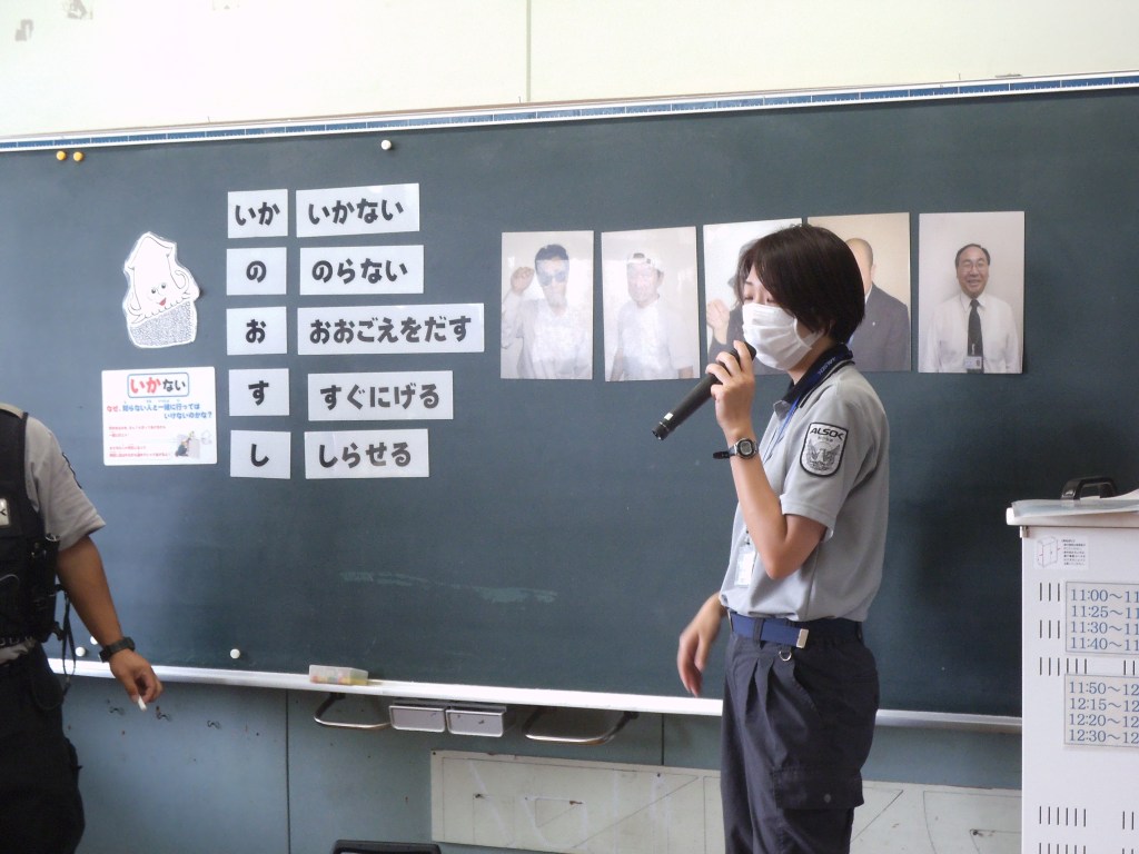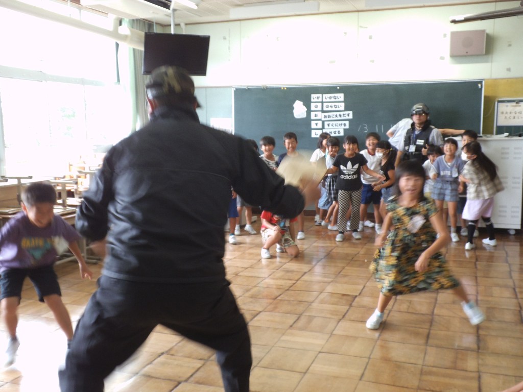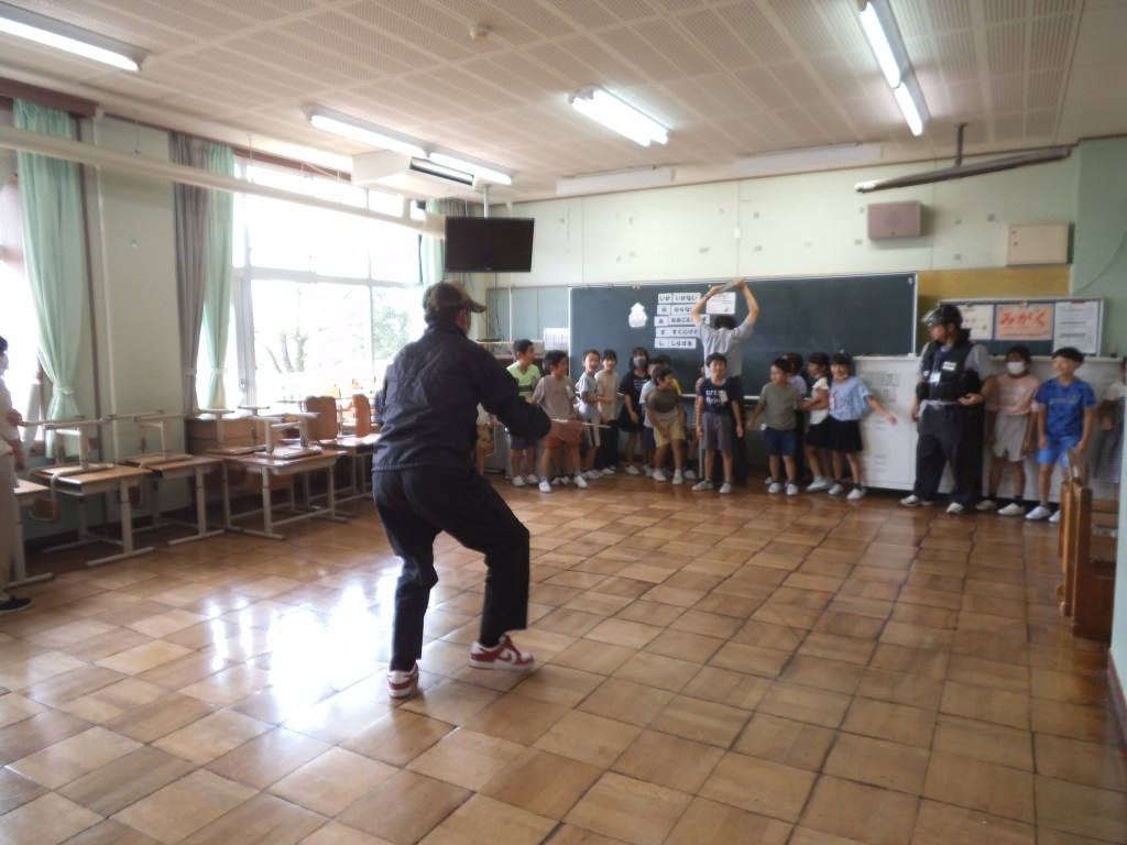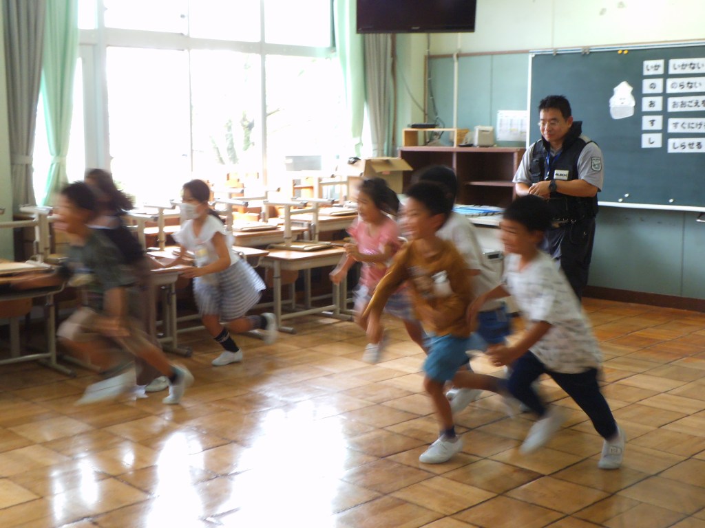 2日に2年生、4日に1年生が不審者対応訓練に参加しました。ALSOKの協力により、「い・か・の・お・す・し」の意味を確認したり、声の出し方、「助けて」と言いながら逃げる、不審者を見たらすぐ大人に報告するなど、たくさんのことを学びました。活動の途中、不審者に変装した職員が部屋に入ってくると、「助けて」と言いながら逃げ、侵入してきた不審者の特徴を担任の先生に知らせていました。