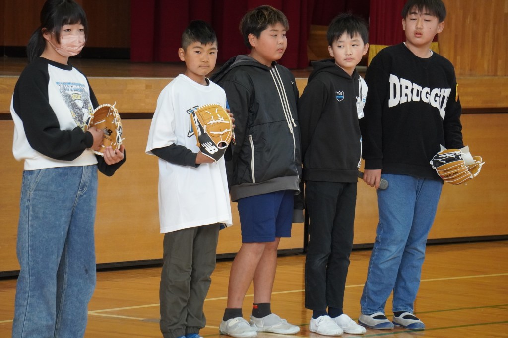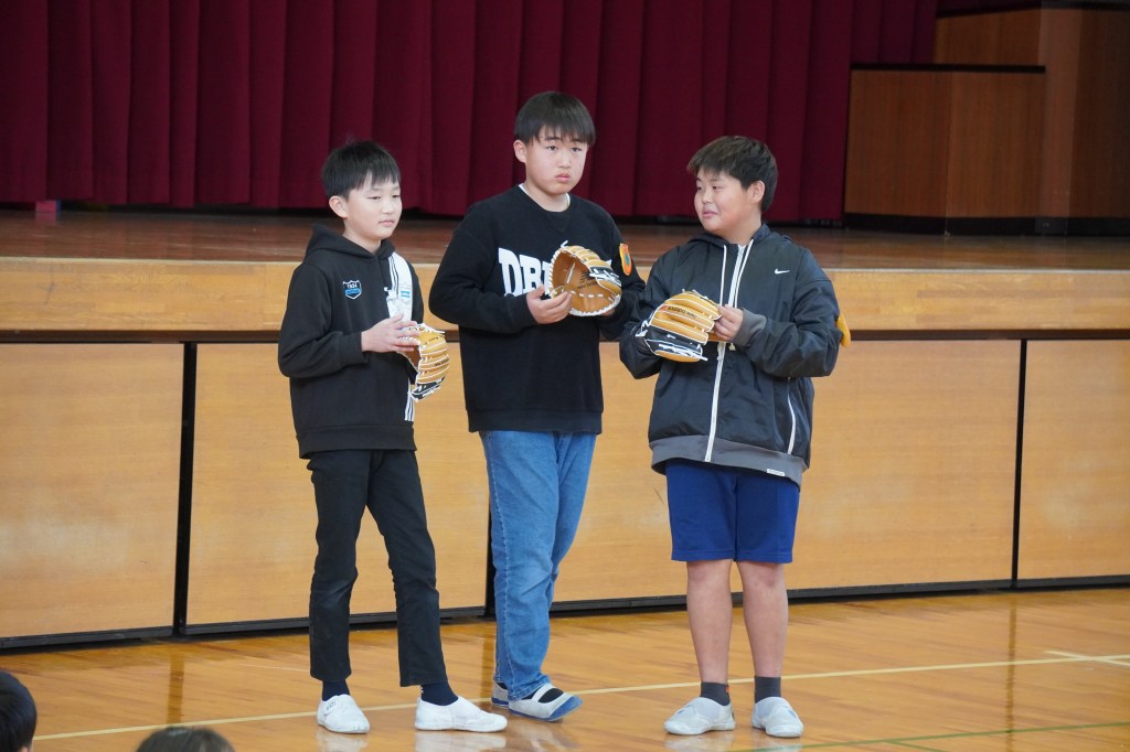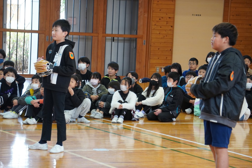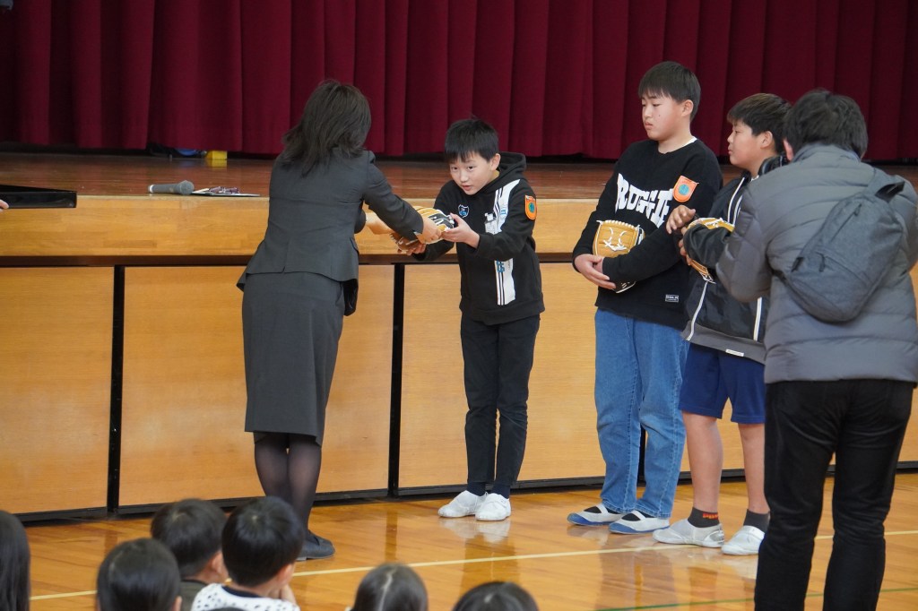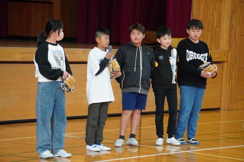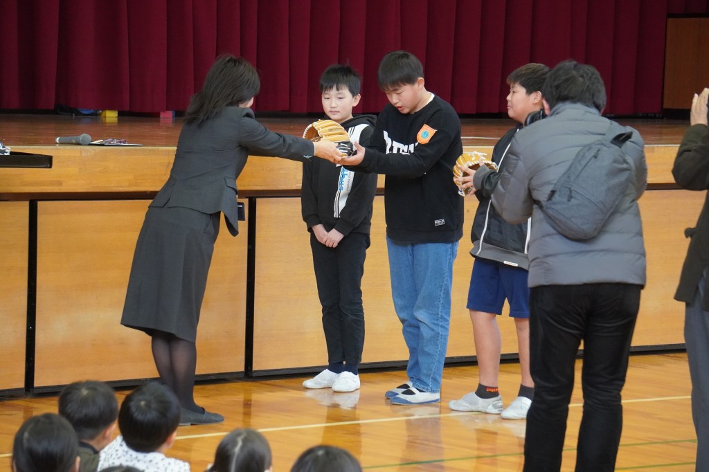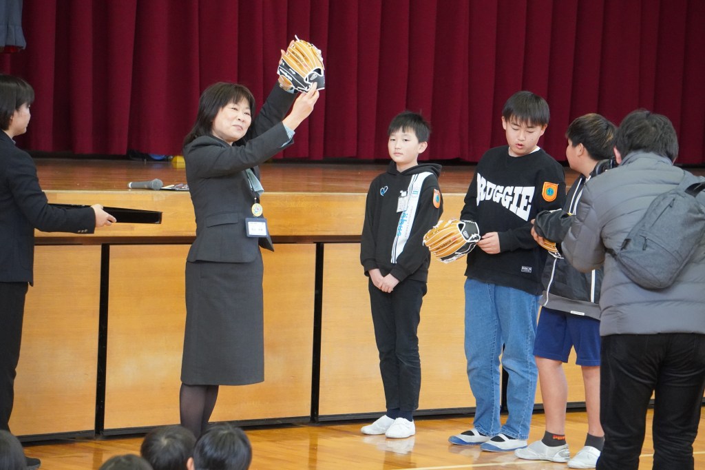 本校にも大谷グローブが届き、贈呈式を行いました。虹の会の委員長の司会で進められた式では、校長先生から「大谷選手の思いを受けて、このグローブを使って、笑顔と元気と勇気をつなぎ、もっともっと明るい学校にしていきましょう。」の言葉とともに3つのグローブが子供たちに渡されました。代表の子供たちは大谷選手にお礼を伝えながら、キャッチボールを披露し、低学年からの歓声があがりました。また、卒業を間近に控えたこともあり、5年生に「大事に使うこと」、「楽しい学校にしていくこと」を願いグローブを渡しました。最後に代表児童は「これからも野球を続け、大谷選手のような野球選手になりたい」と夢も語りながらお礼の言葉を述べました。