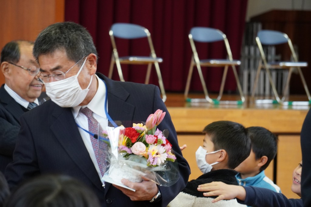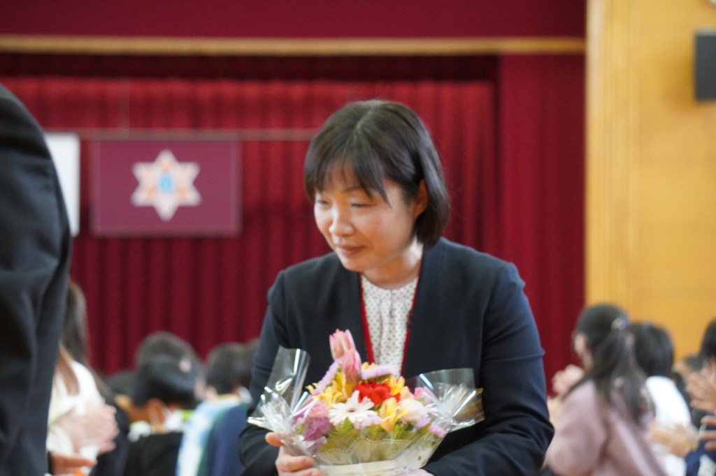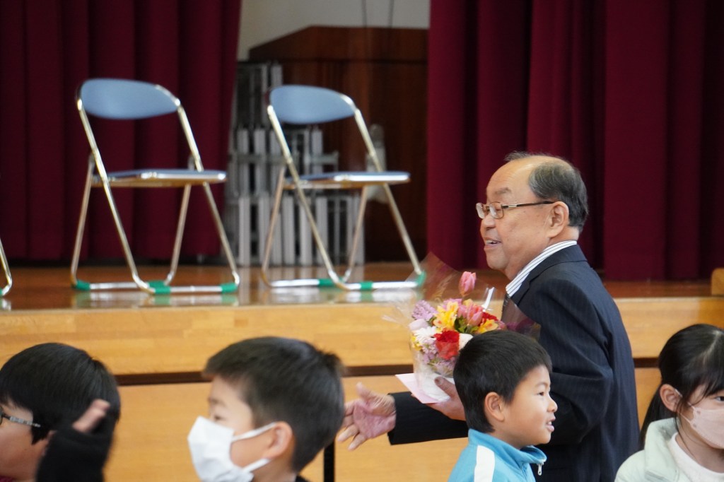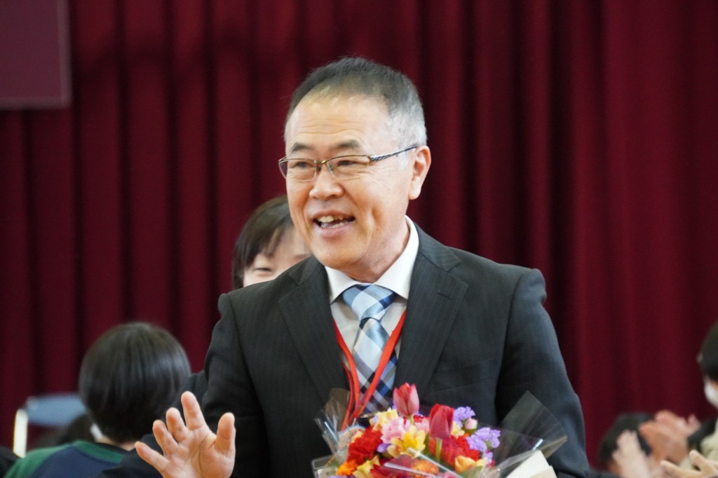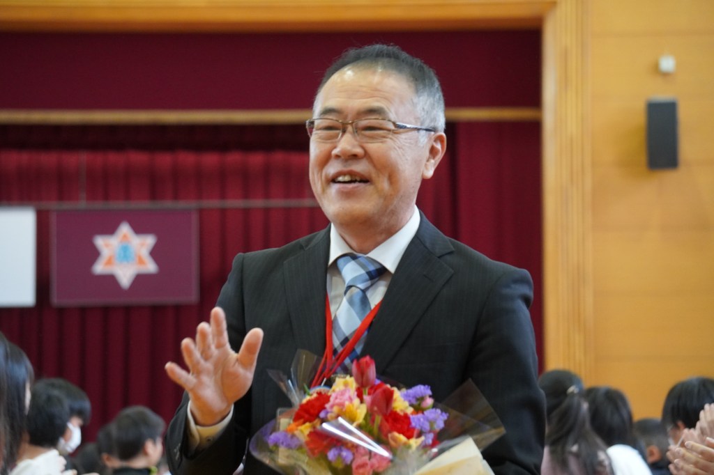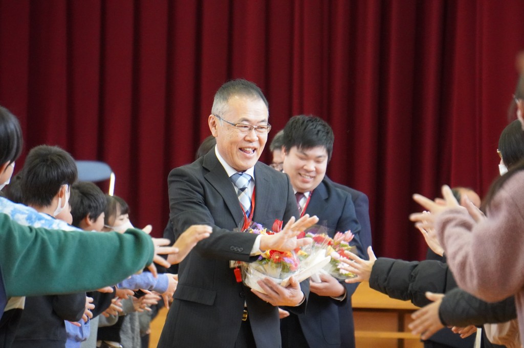 令和5年度末人事異動により、5名の先生方とお別れすることになりました。牧田年史教頭先生、清水悟先生、増田直司先生がご退職、小城淑子先生、西谷知希先生はご栄転となりました。牧田教頭先生は退職後、焼津西小でお勤めすることなり、小城先生は教頭先生として大富小学校へ、西谷先生は小川小学校へ異動となりました。大井川東小学校を支えてくださった5名の先生方とお別れすることはとてもさみしいことですが、みんなで笑顔で送ろうと決め、元気なしずはまっ子の笑顔で先生方を送りました。新転地でもご活躍ください。