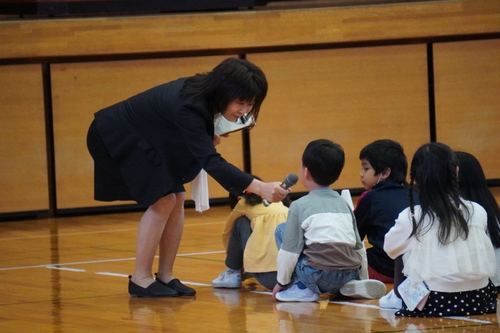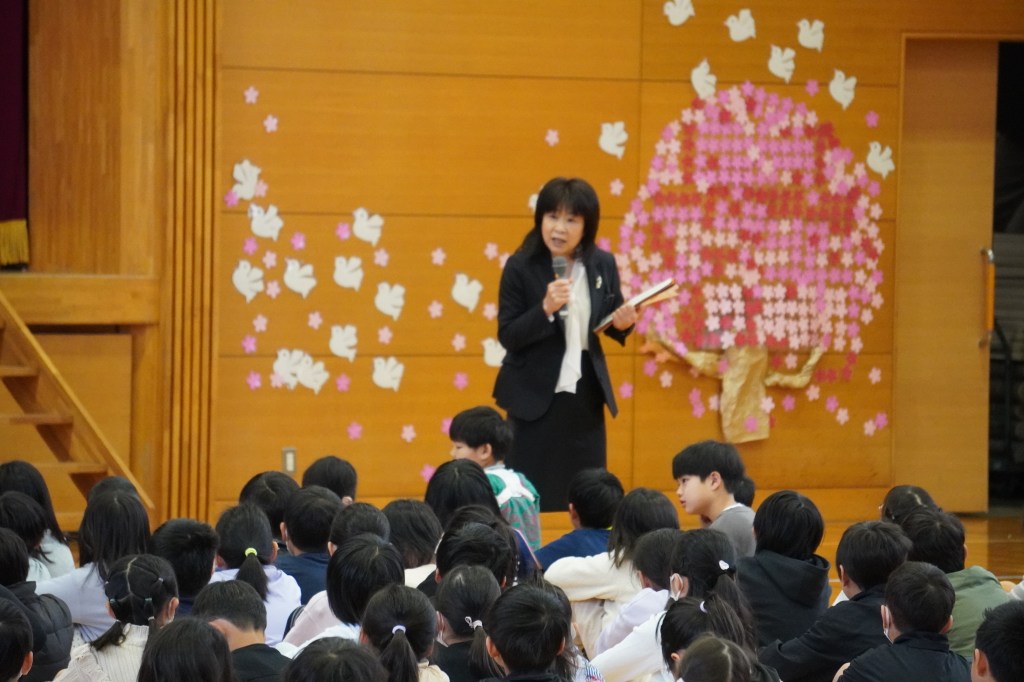 新任式のあとは、本年度の始業式を行いました。新しい学級の仲間と一緒に集まるのは初めてのこと。1学年進級し、今までとは違う場所に集まり、なんだか緊張していた子供たちでした。校長先生より、春の花のように、今のみんなは昨年度頑張った自分、とても輝いています。また、一年たったとき、自分らしい花が咲かせられるように取り組んでいきましょうというお話がありました。また、なかよしのステージの始まりでもあることから、笑顔いっぱい、友達いっぱいのステージになるように、新しい仲間とあいさつをしたり、話をしたりして関わっていきましょうと話がありました。6年生からは今年頑張りたいことの発表があり、代表して教科書を授与してもらいました。大変立派な態度でした。そして、子供たちが一番楽しみにしていた担任の先生の発表がありました。全員で、「この仲間と一緒に頑張ろう。おー!」と声をあわせました。1年間、よろしくお願いします。