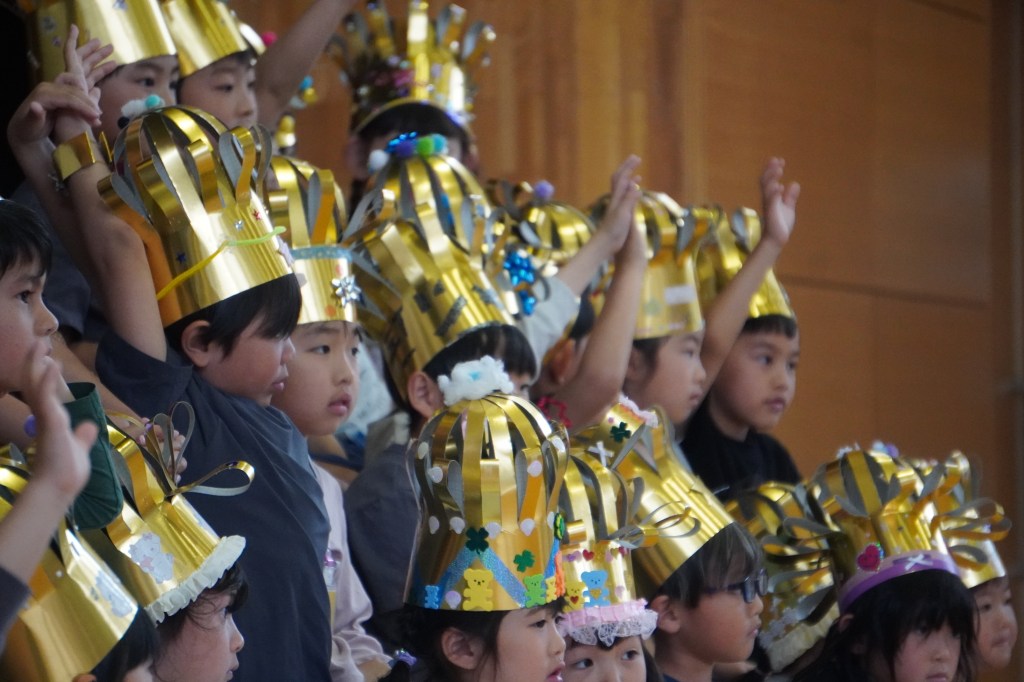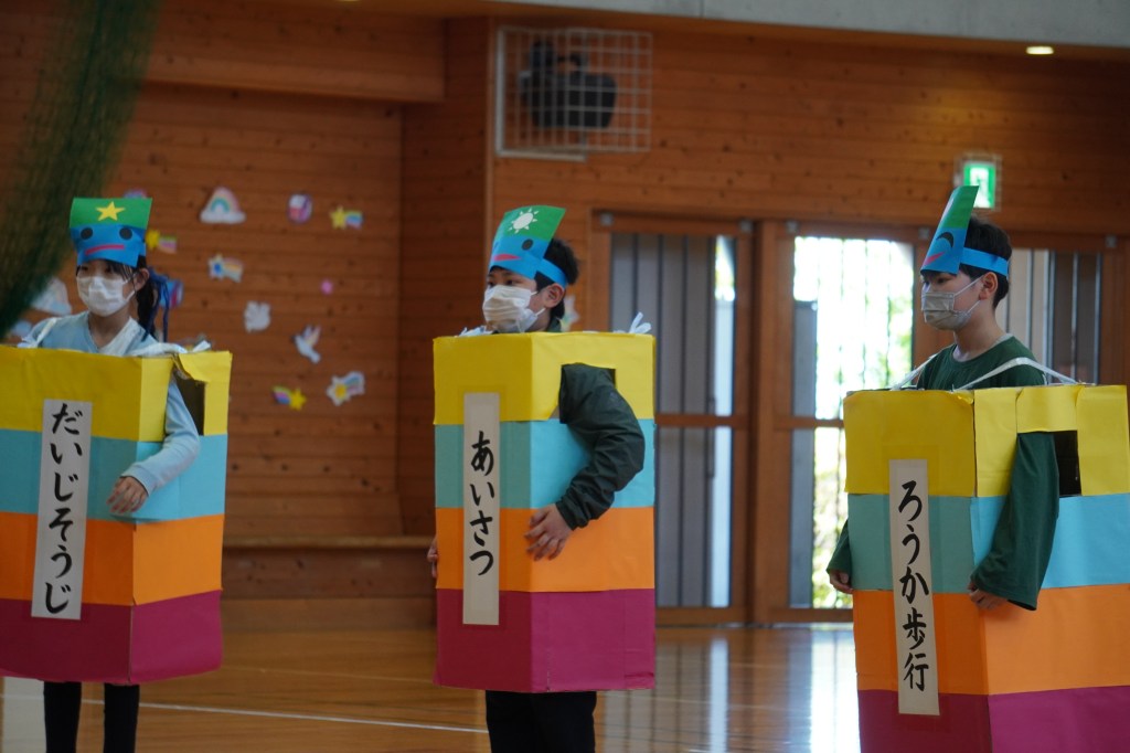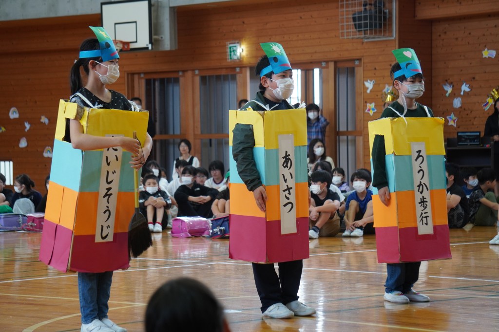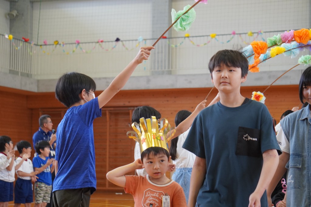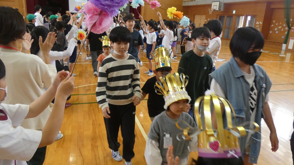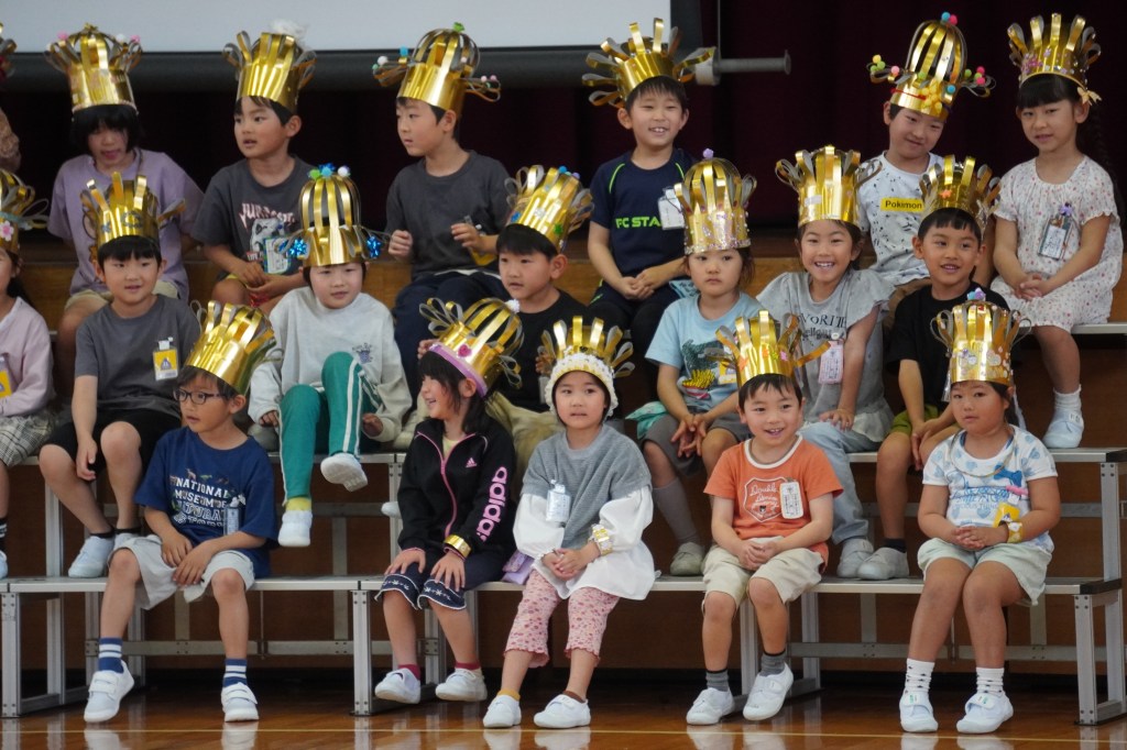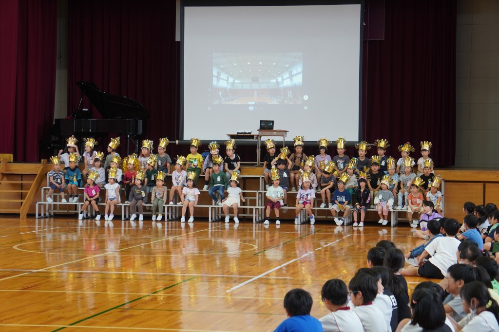 入学してきた1年生を歓迎する会が6年生の子供たちの計画により行われました。6年生からプレゼントされた王冠を嬉しそうにかぶった1年生は6年のペアさんと一緒ににこにこ笑顔で入場すると、全校児童から大きな拍手で迎えられました。それぞれの学年からは学校のことを早く知ってもらおうと工夫されたクイズが出されました。先生方からもお祝いのメッセージをもらい、1年生はそのお返しに「パプリカ」を可愛らしく踊りました。レインボー3兄弟もみんなの歓迎を喜び、全員でとても楽しく時間を過ごしました。最後に虹の会委員長から2年生から5年生に「みんなで協力して楽しい会にしてくれてありがとうございました。」とお礼の言葉が贈られました。