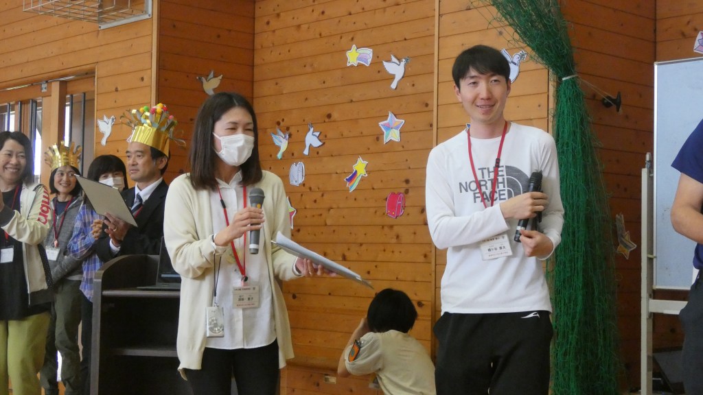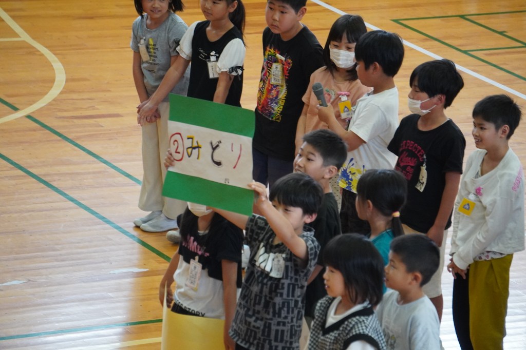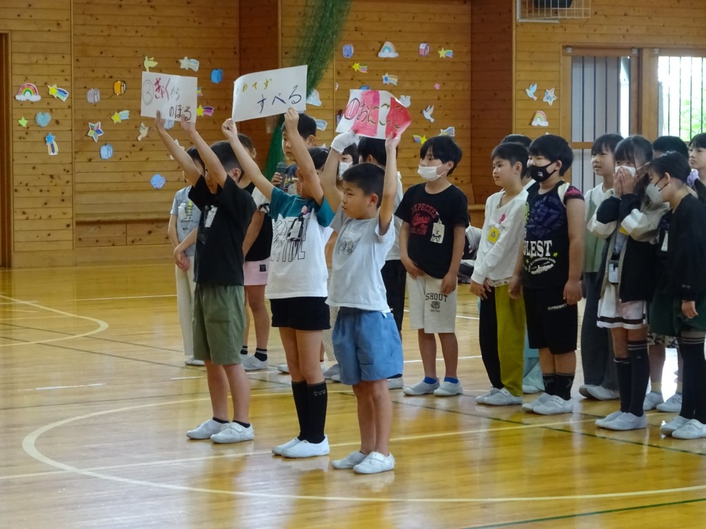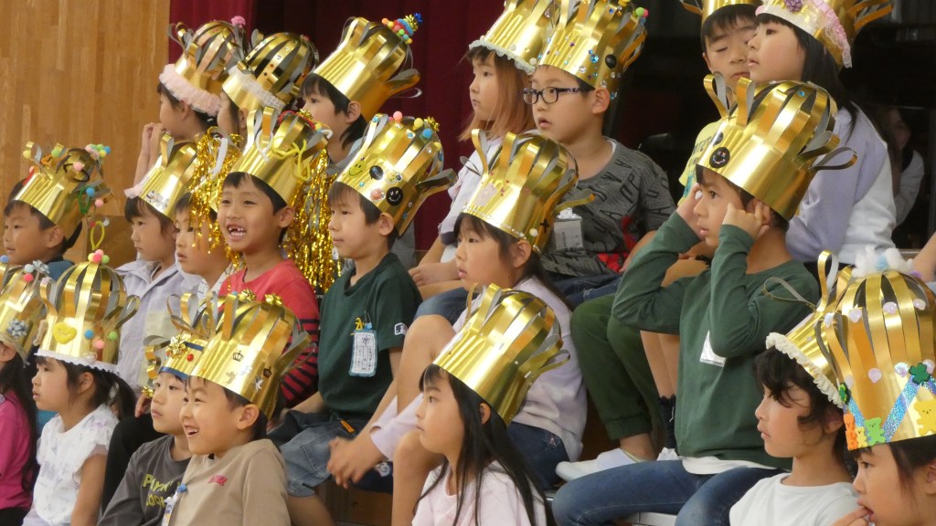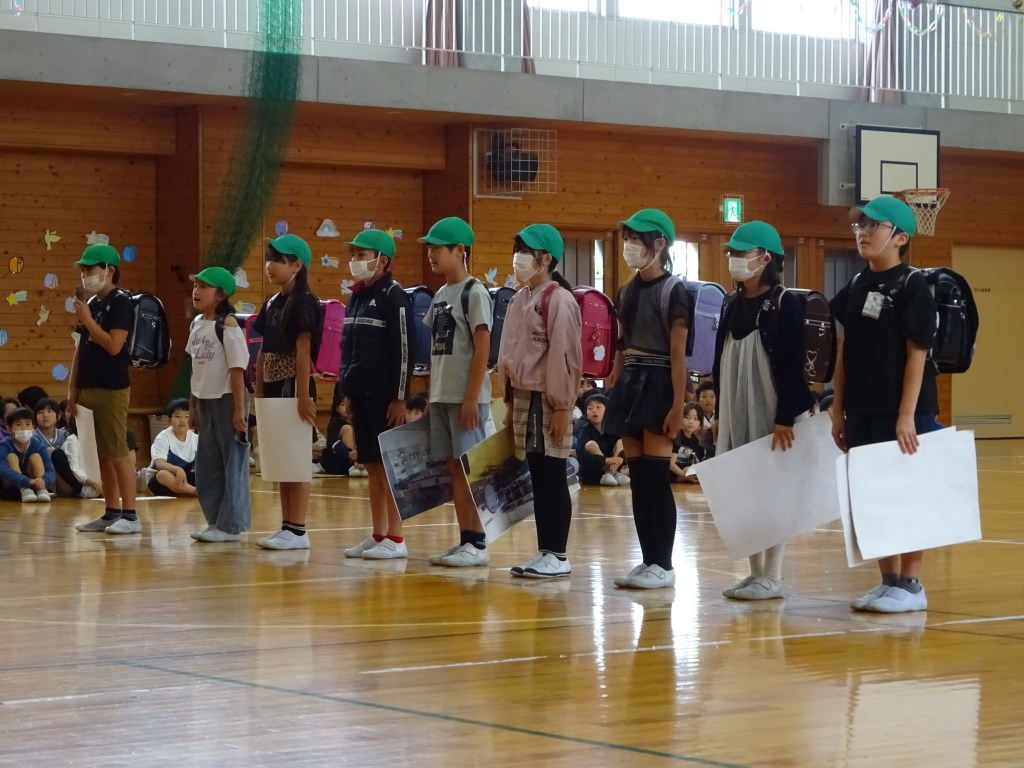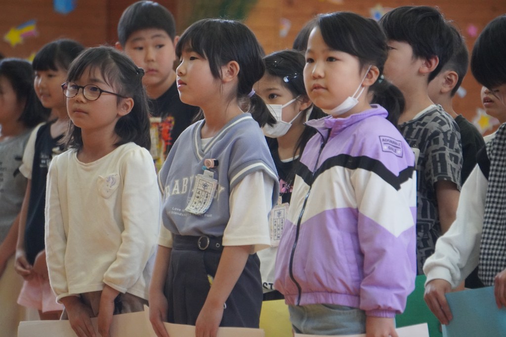入学してきた1年生を歓迎する会が6年生の子供たちの計画により行われました。6年生からプレゼントされた王冠を嬉しそうにかぶった1年生は6年のペアさんと一緒ににこにこ笑顔で入場すると、全校児童から大きな拍手で迎えられました。それぞれの学年からは学校のことを早く知ってもらおうと工夫されたクイズが出されました。先生方からもお祝いのメッセージをもらい、1年生はそのお返しに「パプリカ」を可愛らしく踊りました。レインボー3兄弟もみんなの歓迎を喜び、全員でとても楽しく時間を過ごしました。最後に虹の会委員長から2年生から5年生に「みんなで協力して楽しい会にしてくれてありがとうございました。」とお礼の言葉が贈られました。