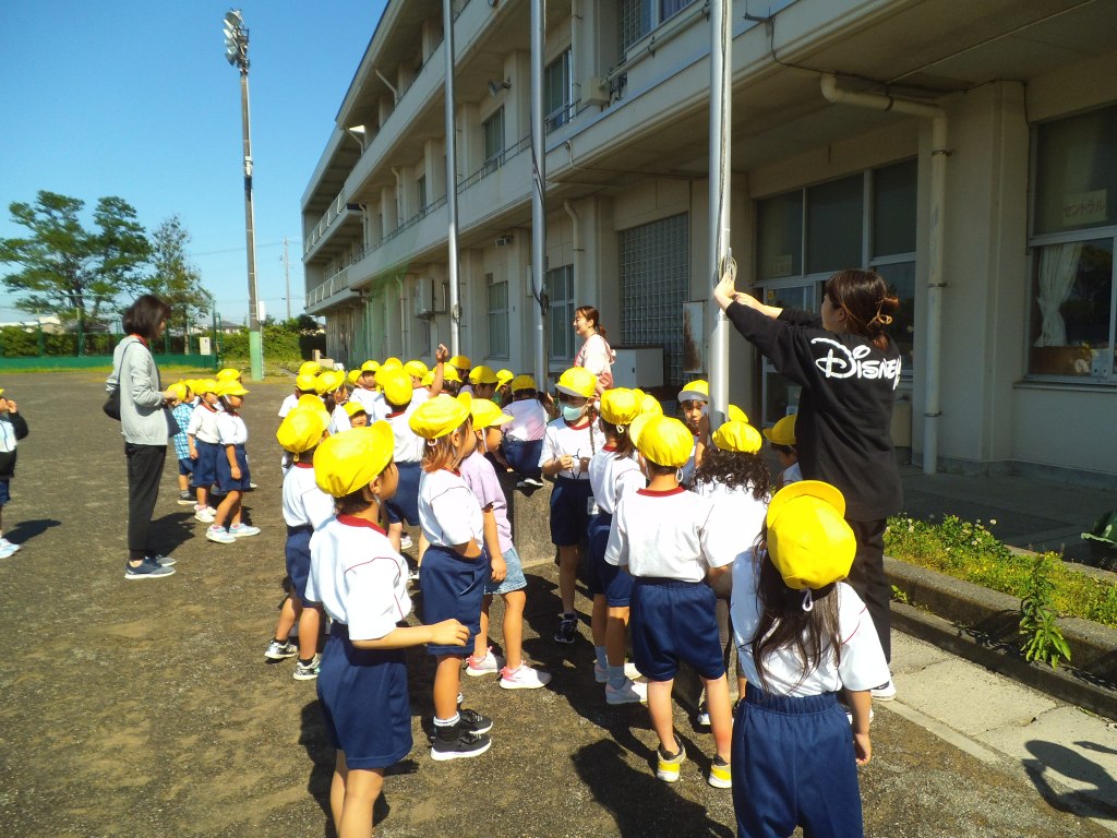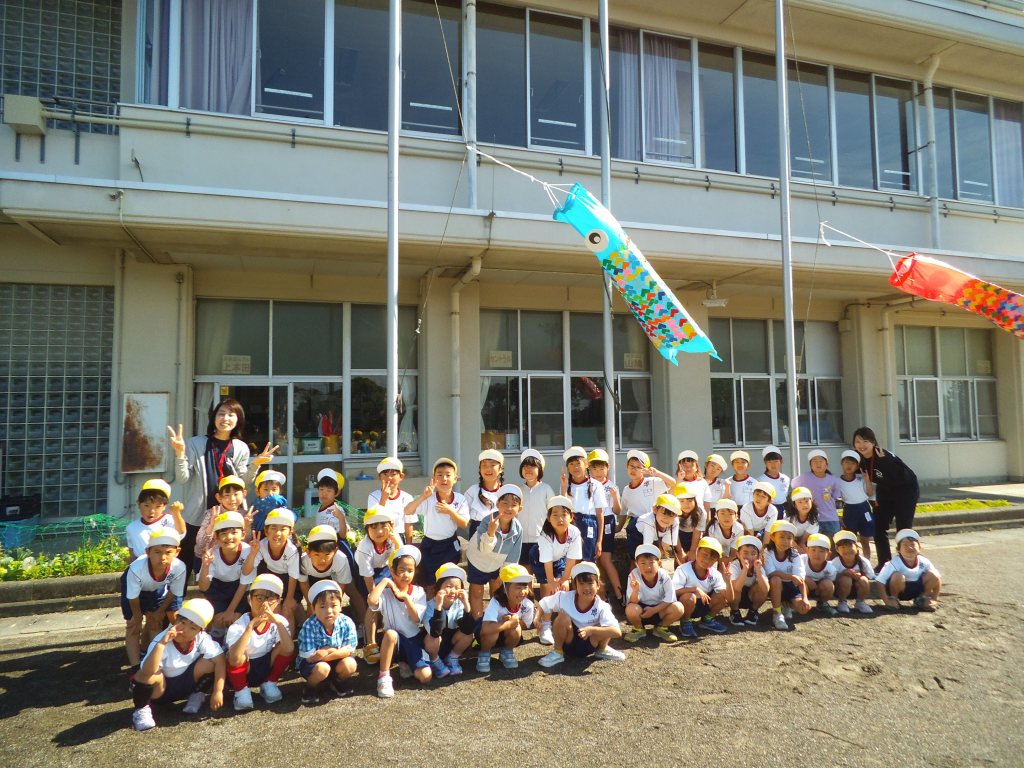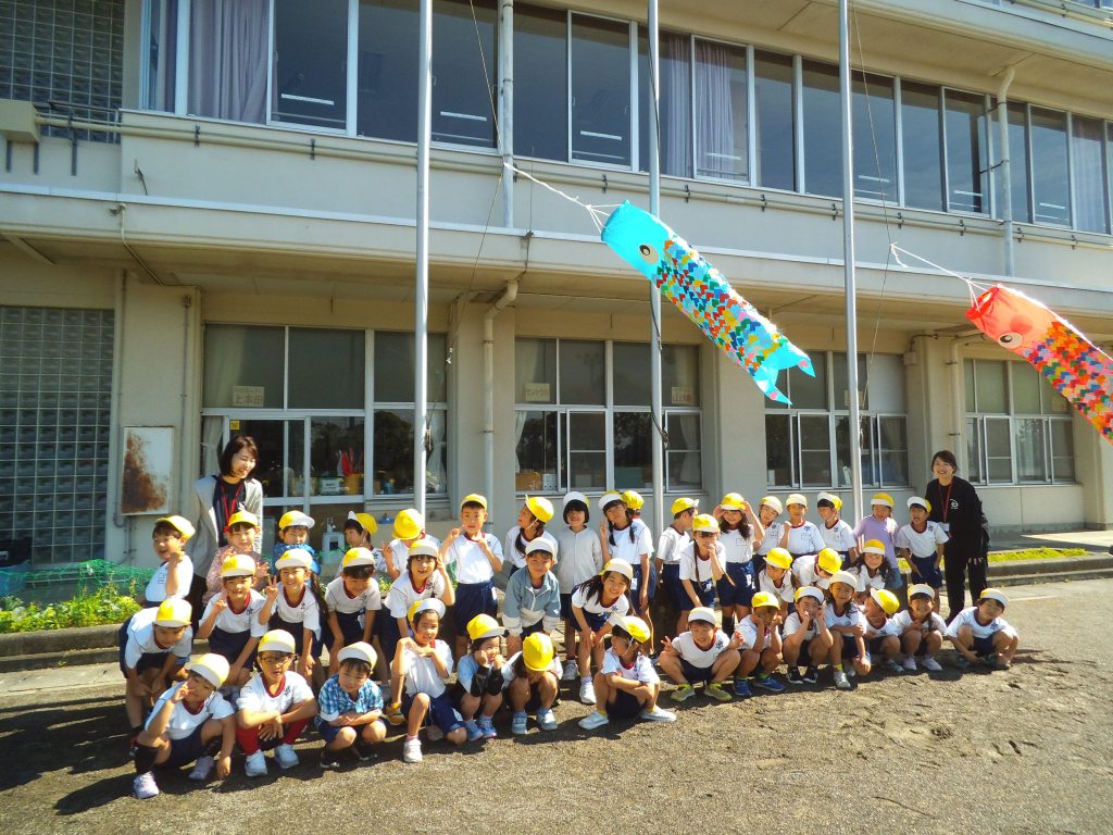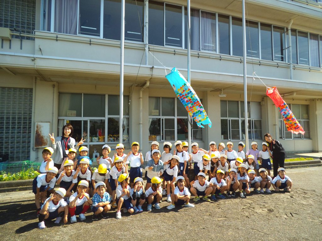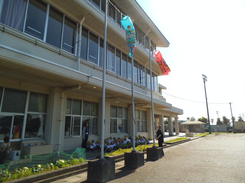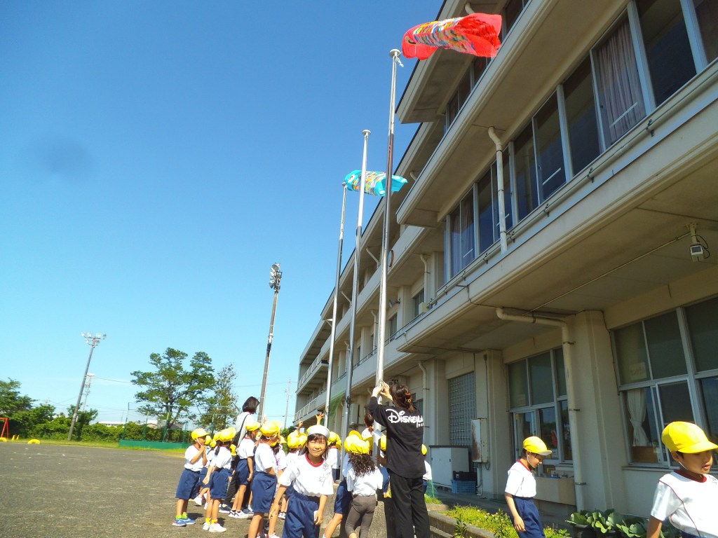 5月の気持ちのよい風が吹く中、1年生の子供たちが作ったこいのぼりをあげました。入学して1ヶ月、1年生もすっかり学校生活になれ、友達も増え、勉強も頑張っています。これからの成長を願い、一人ひとりが作ったうろこを身につけたこいのぼりが1年生の思いをのせて、元気よく泳いでいます。