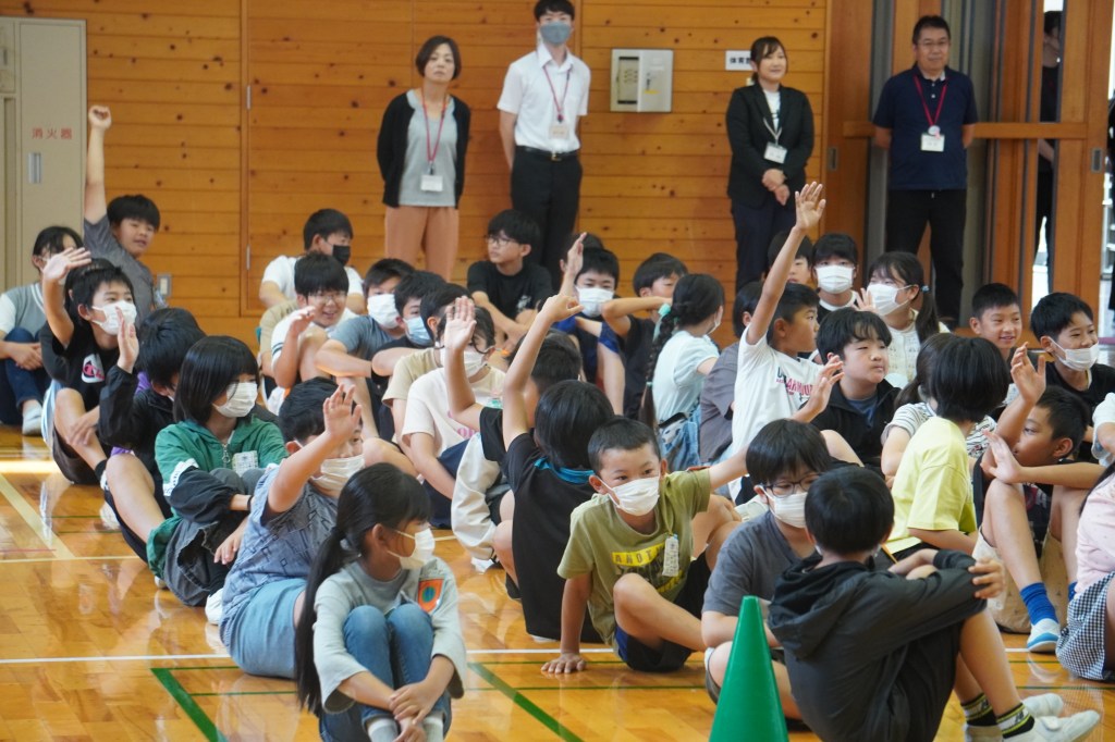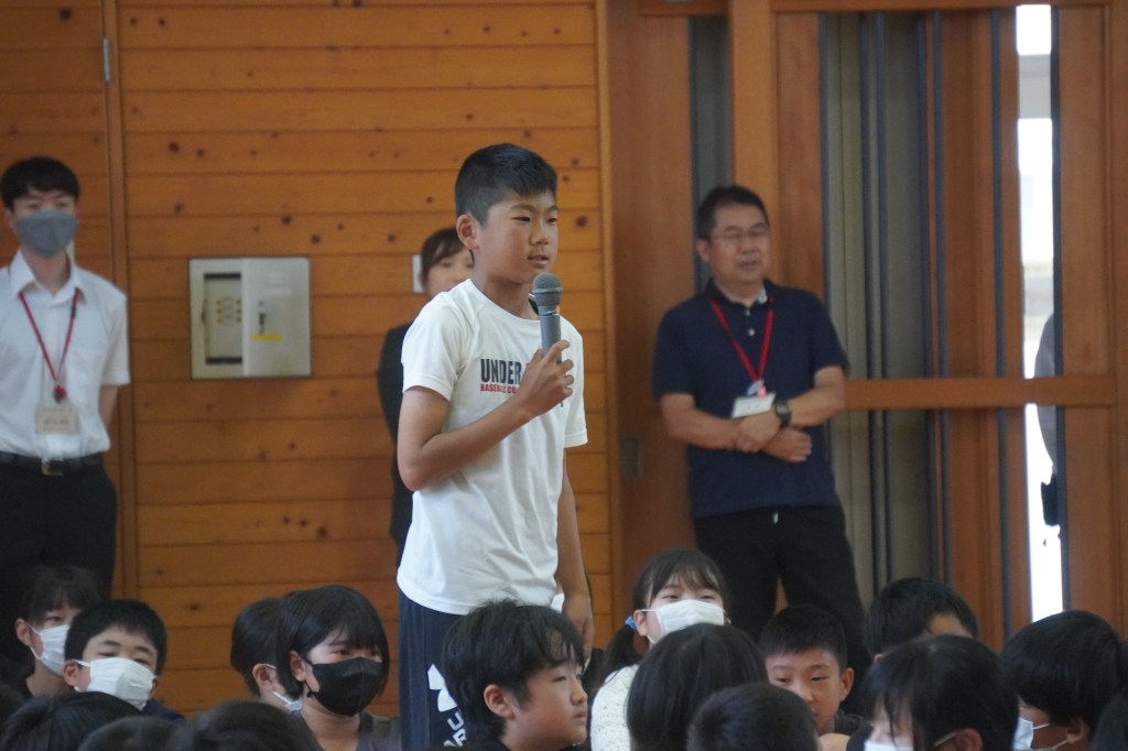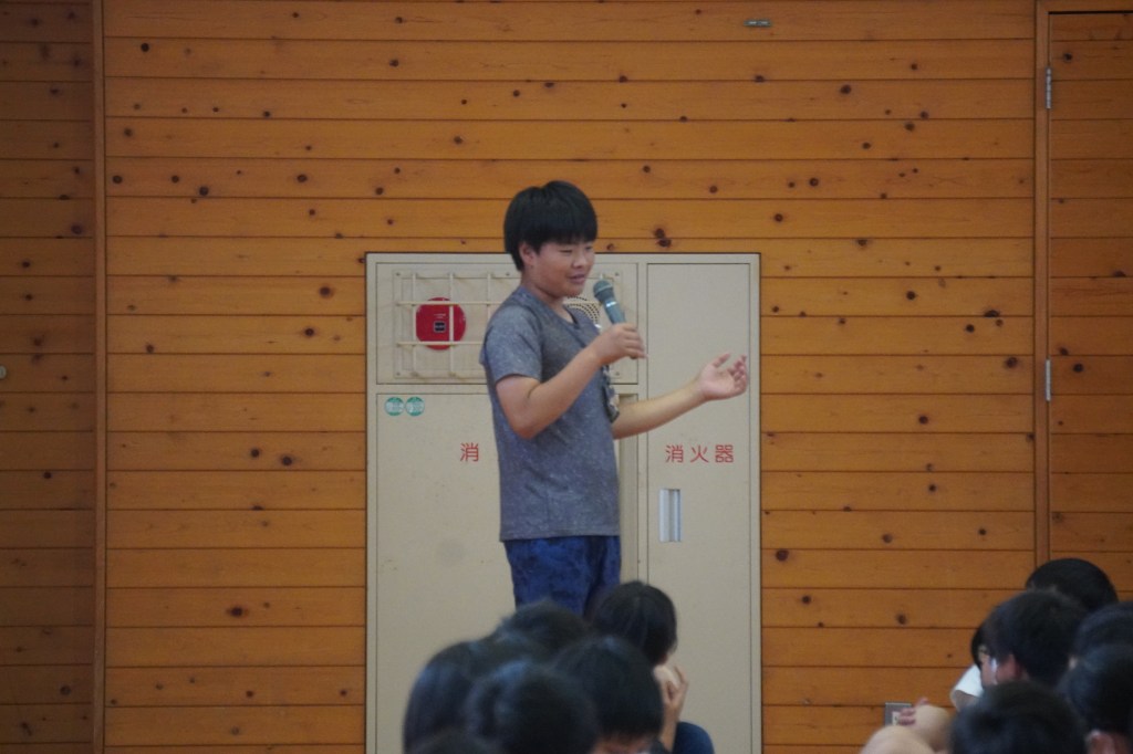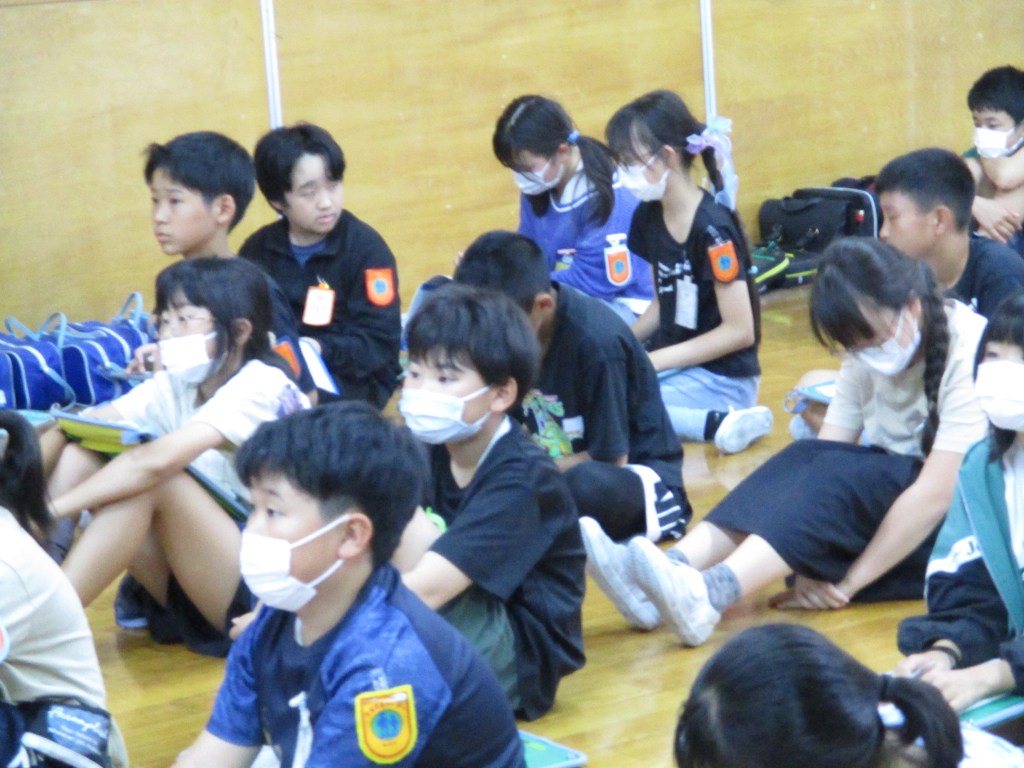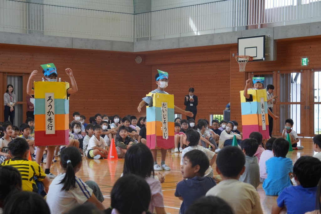 暑い日が続くようになり、熱中症の危険を感じるようになりました。子どもたちにも熱中症対策の意識を高めてほしいと、毎年、この時期に全学年対象に朝の保健指導を行っています。生徒指導主任の先生と養護教諭の先生による寸劇から、どのように生活すると熱中症対策につながるかを考えました。登校する前、運動する前にもしっかり水分を取ることが大切だと知りました。