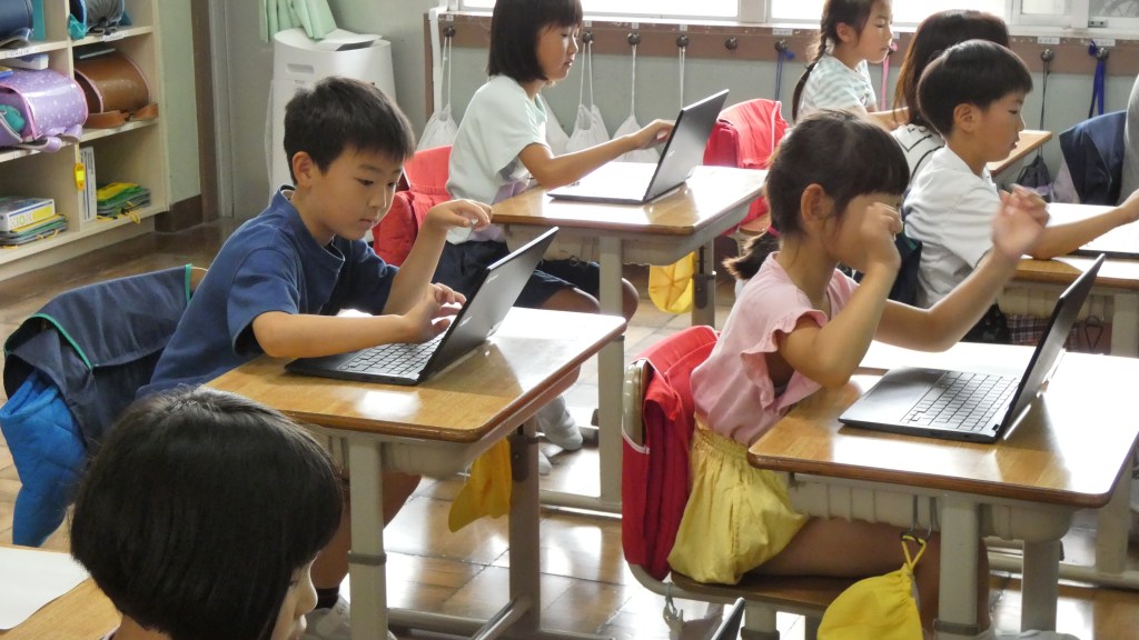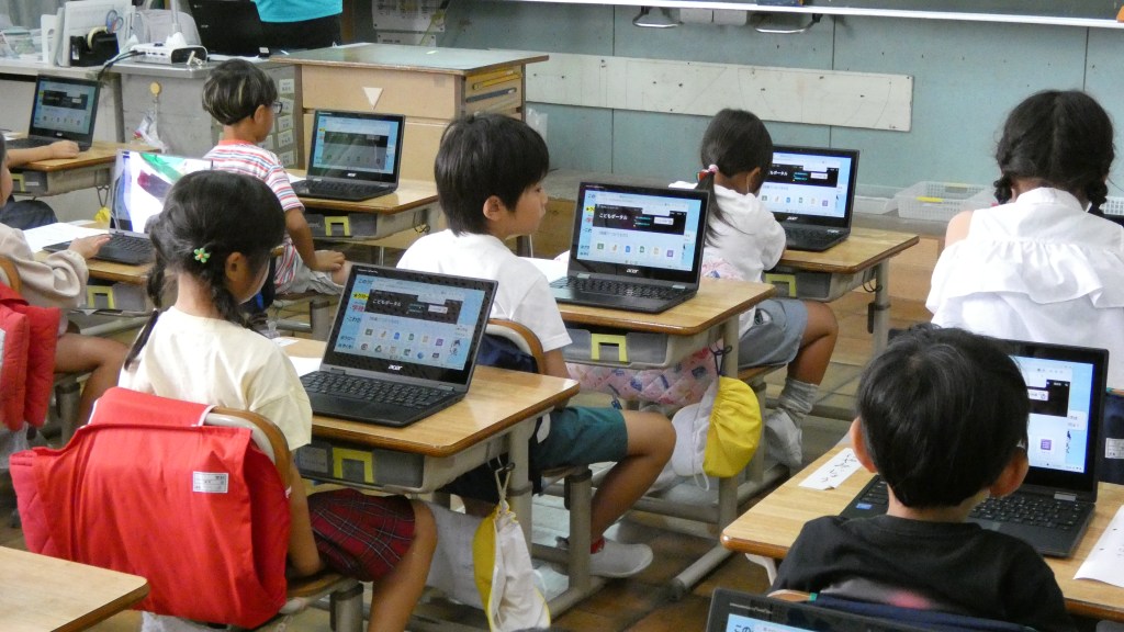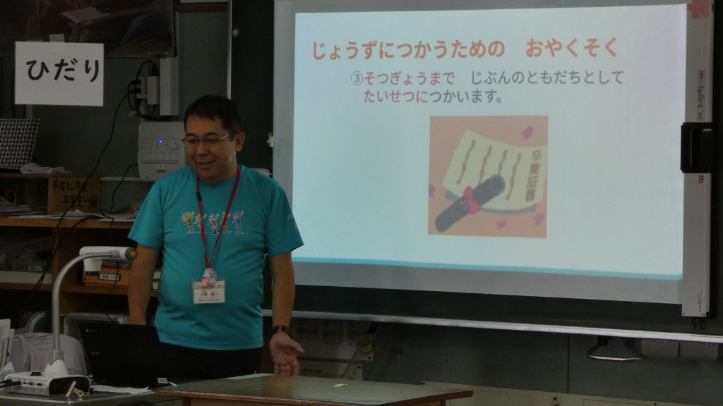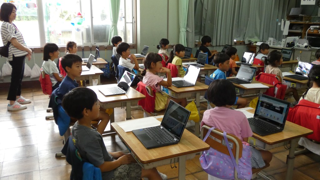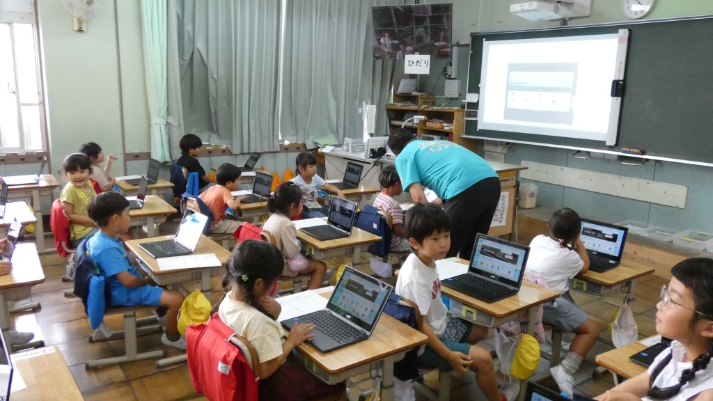 小学校の学習に一人一台端末が導入され、日常的に使われるようになってきました。本年度入学した1年生も端末を使っての学習を始めるため、その準備としてGIGA開きを行いました。今回は、校内の情報担当の先生が講師となって基本的な操作方法を学びました。