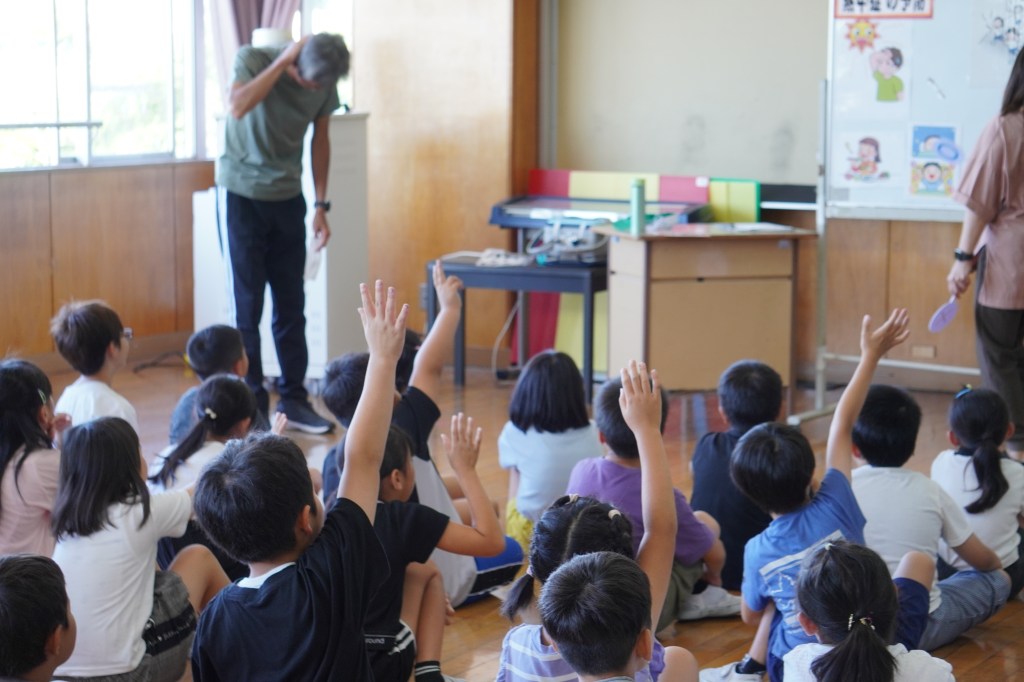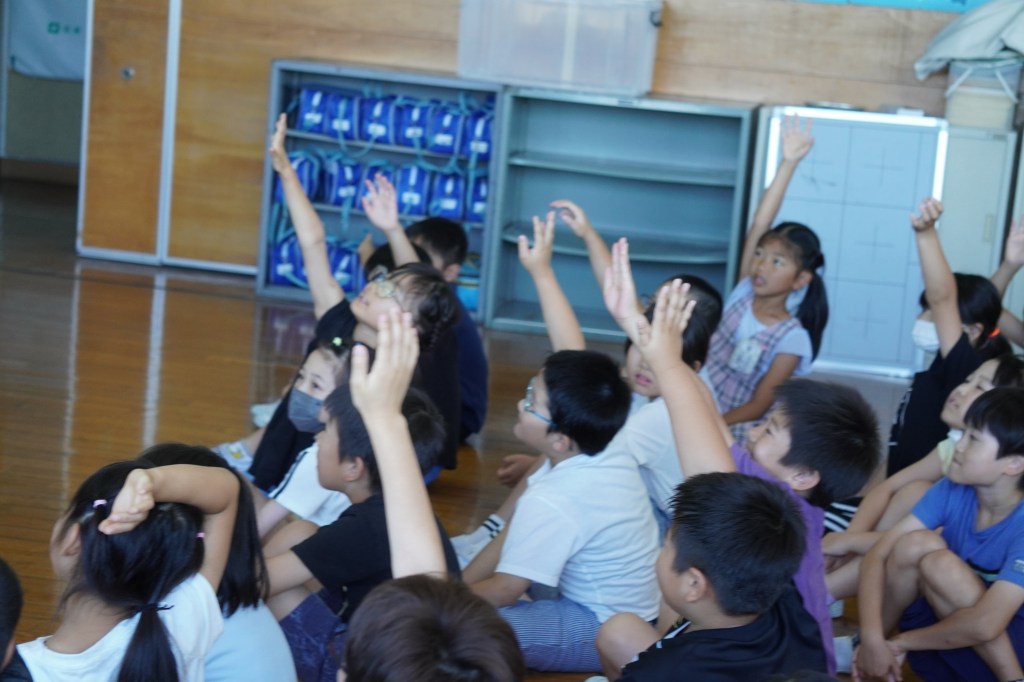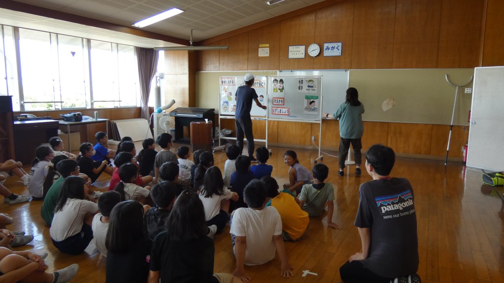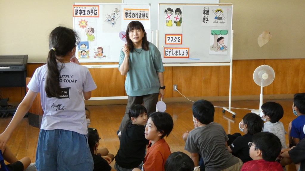 暑い日が続くようになり、熱中症の危険を感じるようになりました。子どもたちにも熱中症対策の意識を高めてほしいと、毎年、この時期に全学年対象に朝の保健指導を行っています。生徒指導主任の先生と養護教諭の先生による寸劇から、どのように生活すると熱中症対策につながるかを考えました。登校する前、運動する前にもしっかり水分を取ることが大切だと知りました。