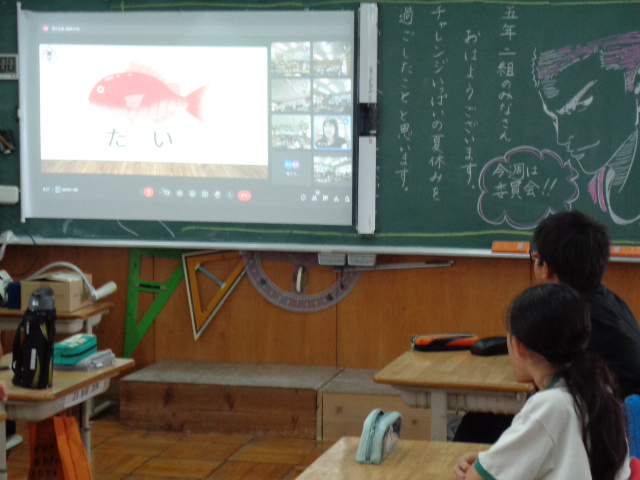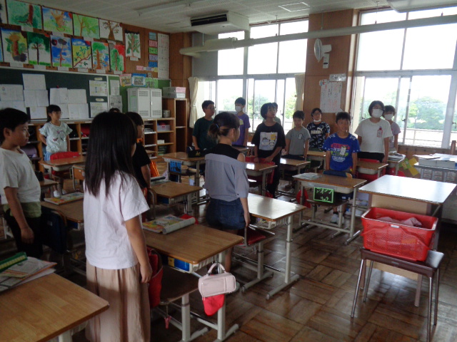 1時間目は、暑さ対策も兼ね教室でのオンラインつどいを行いました。それぞれの学級で校長先生のお話や他の先生方の夏休みのチャレンジのお話を聞きました。子供たちの真剣な眼差しから、夏休みに頑張ってきたこと、これからも多くのことにチャレンジしようと思っていることを感じました。
