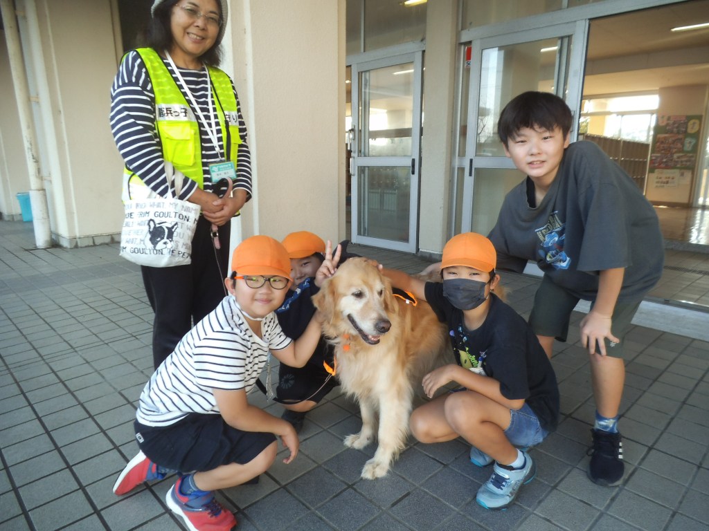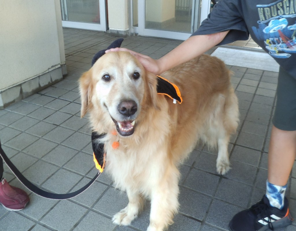 昨日までかがやき教室へ行っていた5年生が元気な様子で登校してきました。5年生をはじめ、しずはまっ子を迎えてくれたのはウォーク。いつもは水曜日に本校へ来てくれるのですが、今日は木曜日でしたが、5年生の登校に合わせてくれました。ウオークはハロウィンの衣装をつけ、登校する子供たちを笑顔にさせていました。ありがとう、ウォーク。