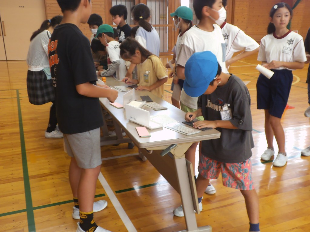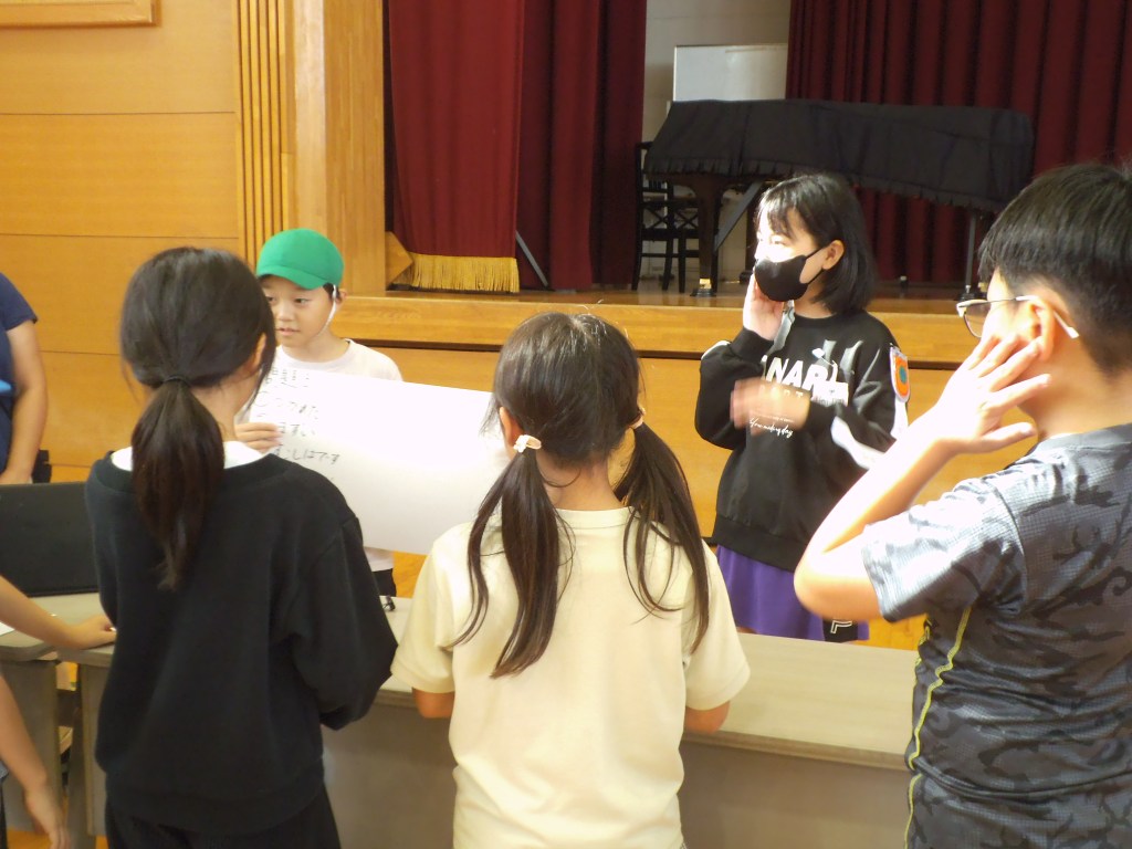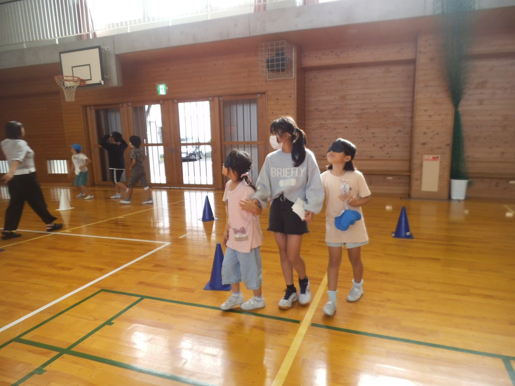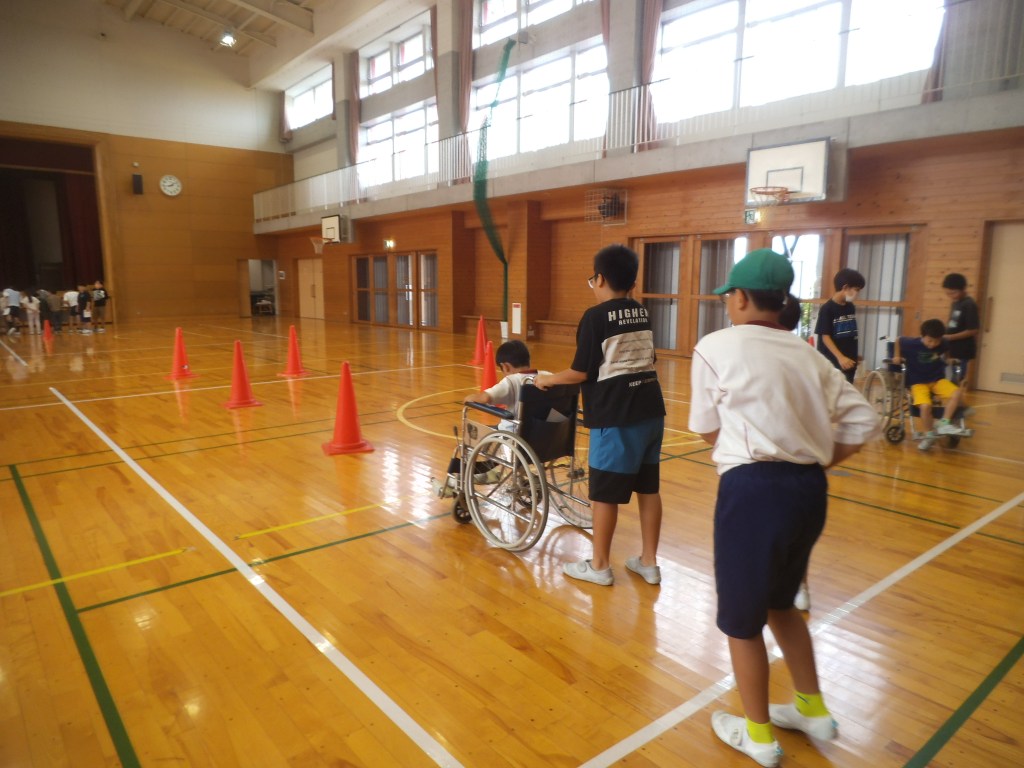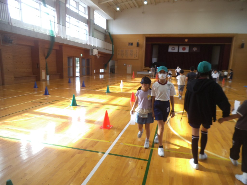 福祉委員会が福祉について知ってもらおうと体験活動を企画しました。車椅子、アイマスク、点字、手話の4つのブースを用意しました。今日は2・5年ペアが体験をしました。アイマスクをした2年生を5年生が丁寧にリードしたり、一緒に手話をしたりしていました。企画した福祉委員会のメンバーも参加している2・5年生に伝わるようにと説明をしながら、熱心に行っていました。