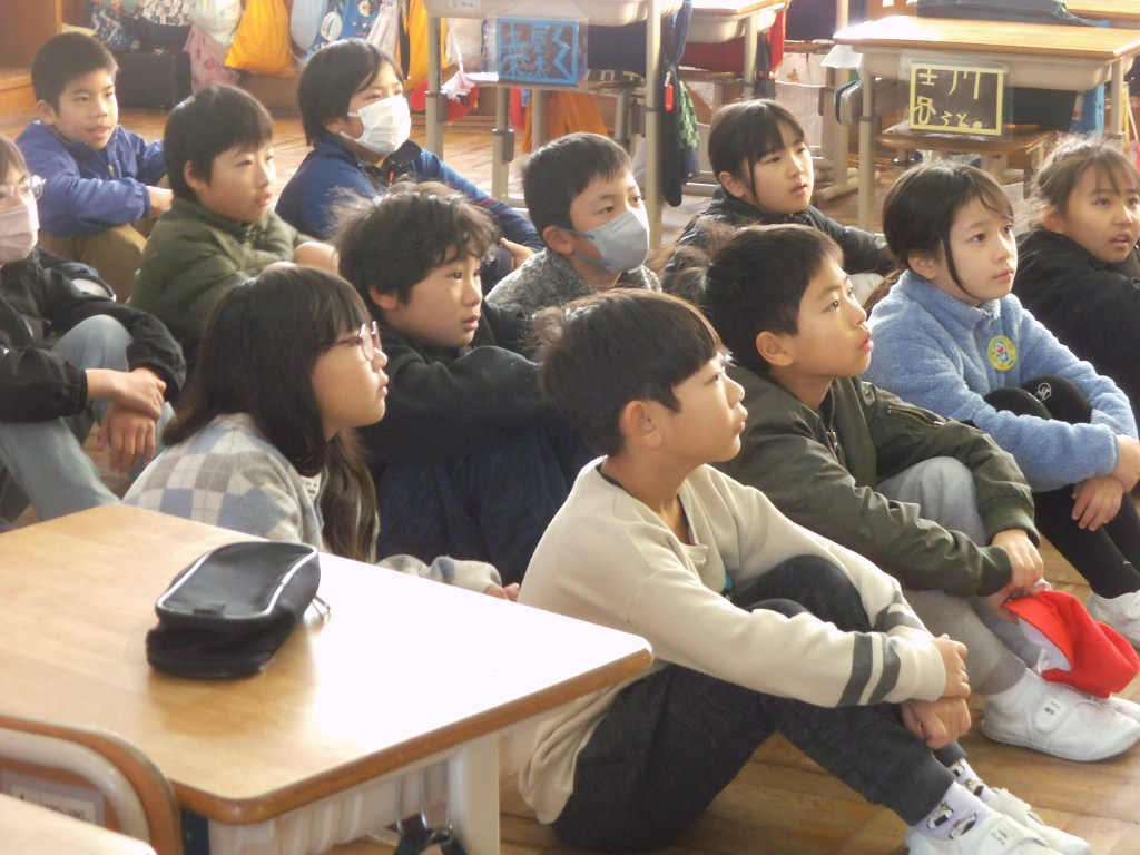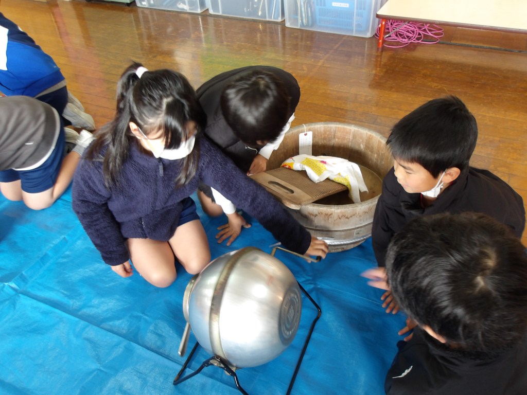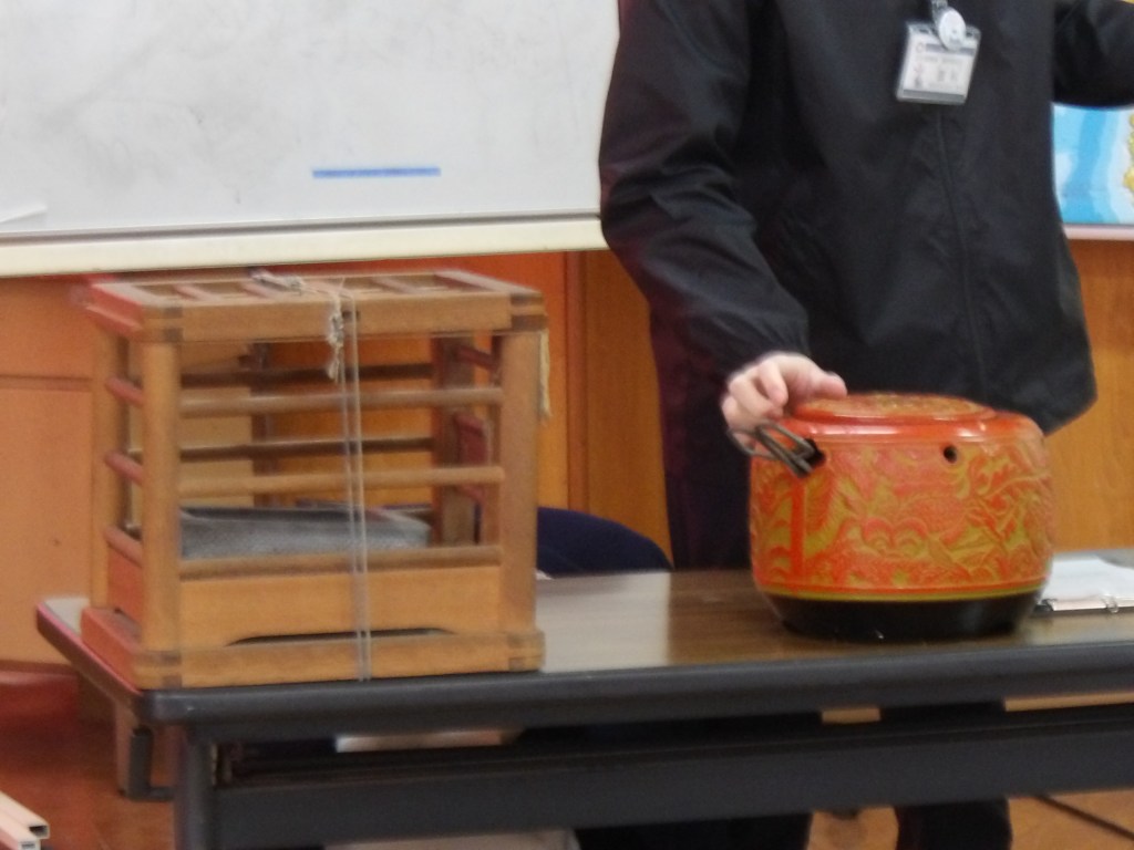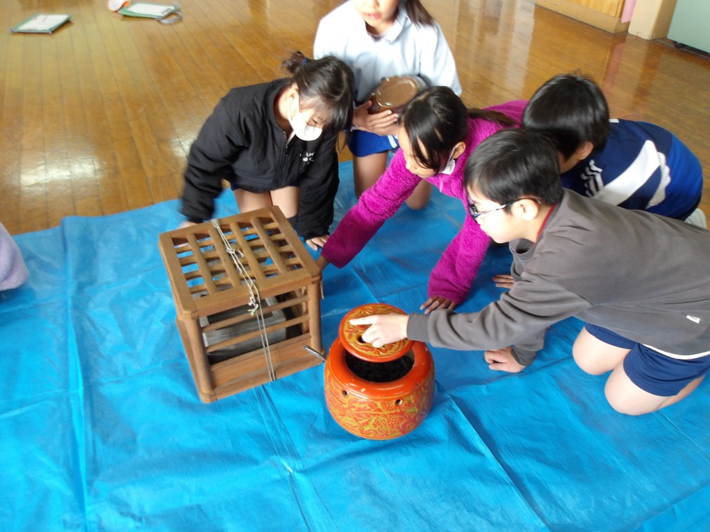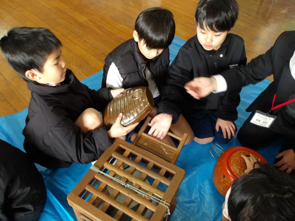 社会科の学習で今と昔の道具の違いを学習しています。焼津市にある歴史民俗博物館の職員の方々を講師にお招きをし、実際の物を見たり、触ったりしながら、今の道具とどう違うのかを体験しました。なんとなく見たことがあるもの、全く知らなかったもの、たくさんの道具を目の前にして、子供たちは興味津々でした。道具を触りながら、今の道具の便利さにも感謝をしているようでした。