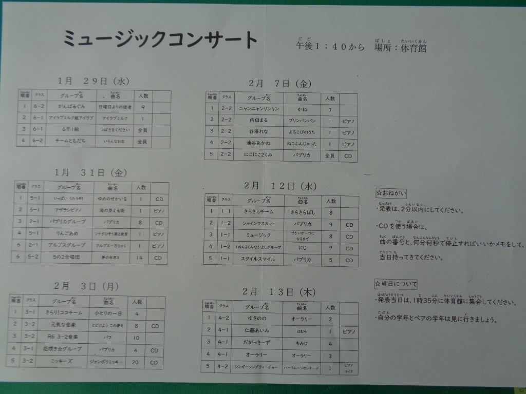 音楽委員会の企画により、今年もミュージックコンサートが開催されることとなりました。昨年度よりも参加者が多く、開催日も増えました。出場する子供も見に行こうと思っている子供もとても楽しみにしています。保護者や地域の方もよろしければ体育館の後ろからご覧ください。