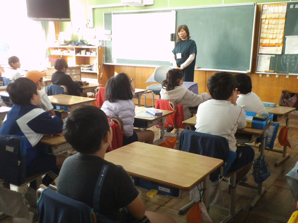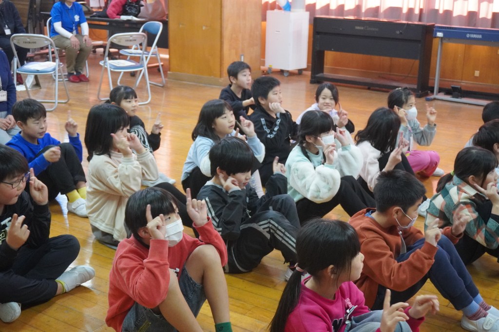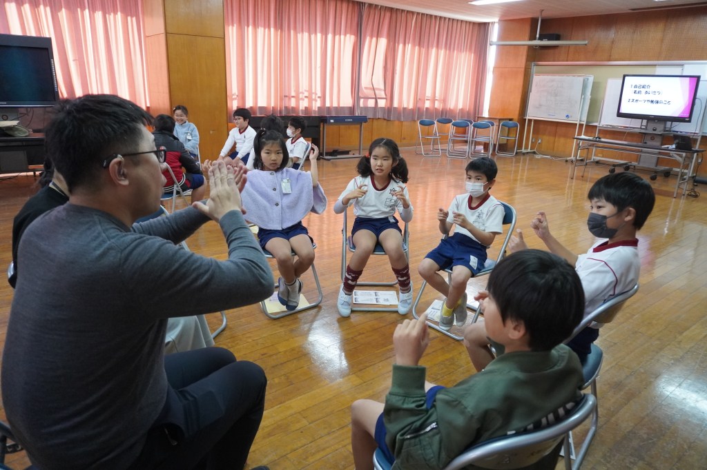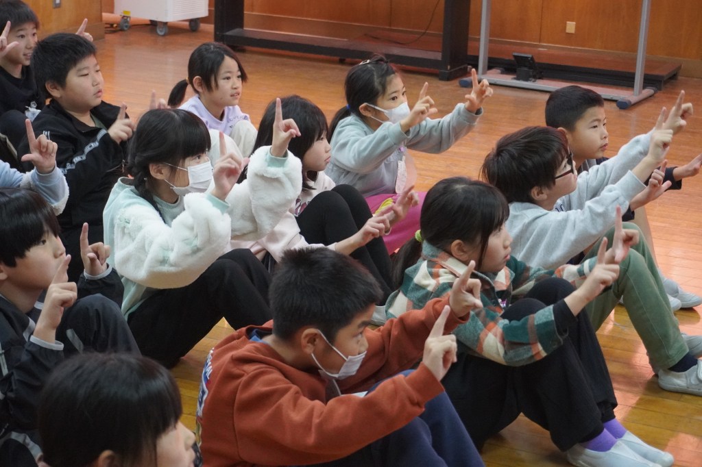 3年生の子供たちは、福祉の学習をしています。世の中にはいろんな人がいて、聞こえが不自由な人もいます。そんな人とも話ができたら、自分も相手も繋がりの輪が広がるだろうという思いで、聾唖者の方々に来ていただき、手話を覚えました。簡単な自己紹介、あいさつ、言葉などを教えていただき、手話を通して聾唖者の方と話をしてみました。その場は音がない静かな空間でしたが、そこにいる人の顔はみんな笑顔で、温かな空気でいっぱいでした。