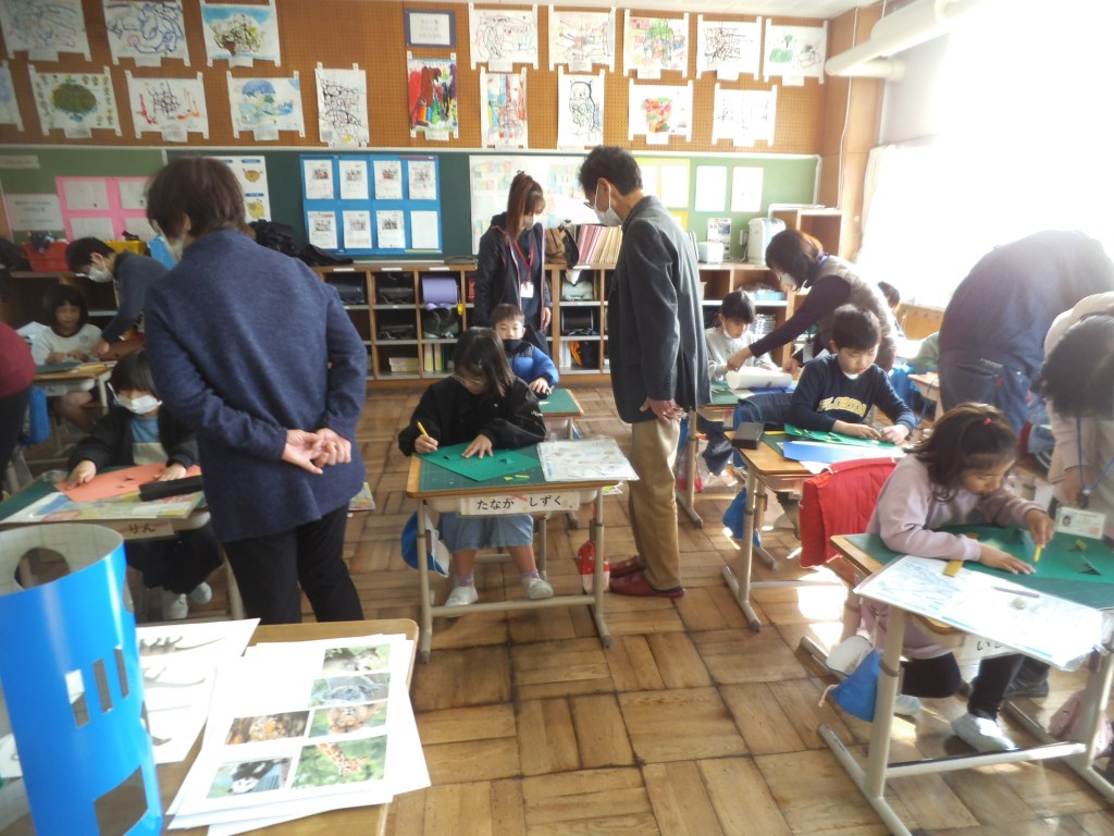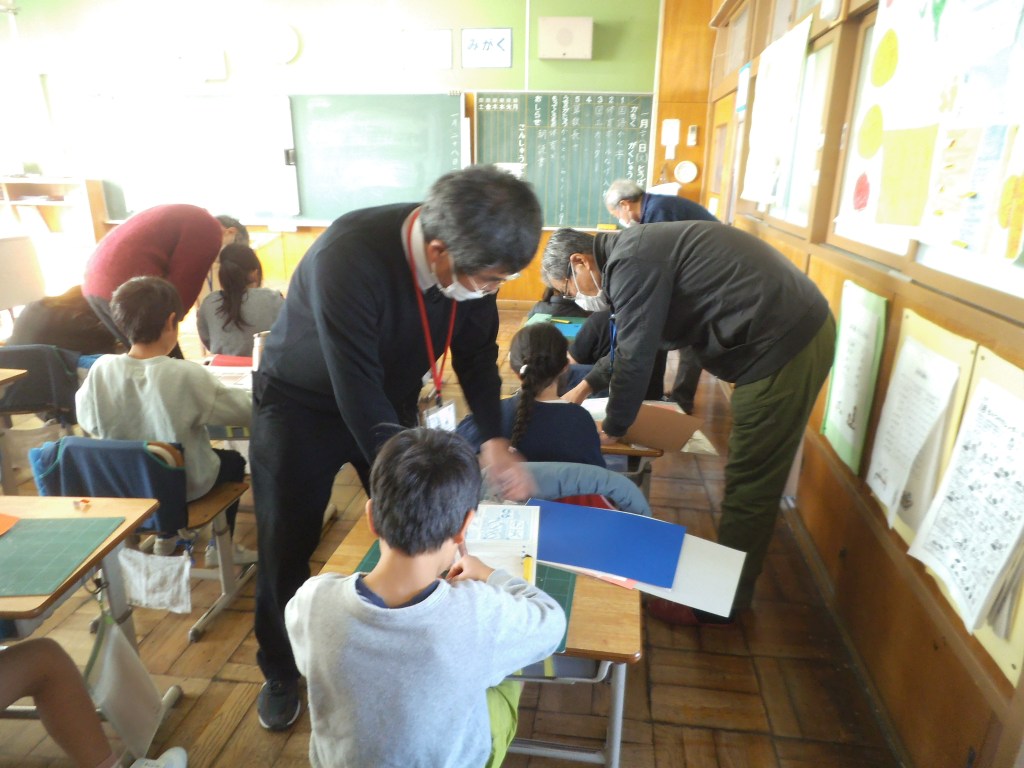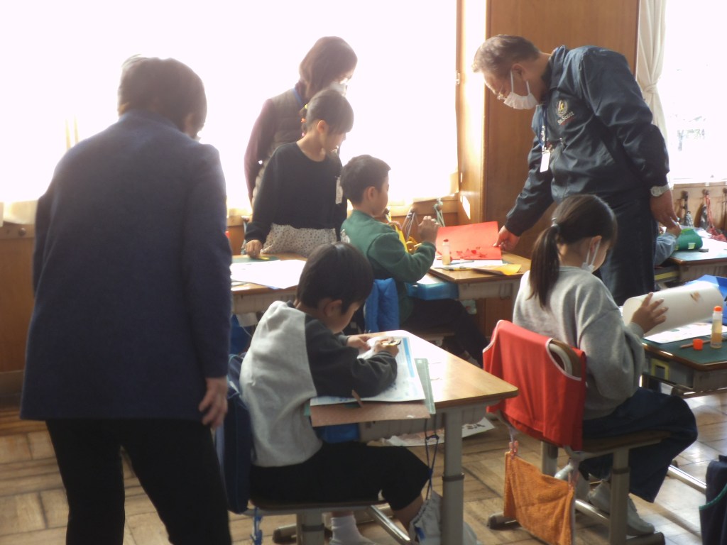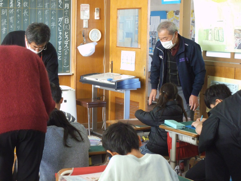 図工の学習でカッターナイフを使っています。初めて使う子も多く、民生委員の方々が使い方指導のお助けに来てくださっています。今回も多くの方が来てくださり、子供一人ひとりに持ち方や、力の入れ具合などを教えてくださいました。子供たちも民生委員の方々の言葉に耳を傾けながら、だんだんに使い方も慣れてきたようでした。