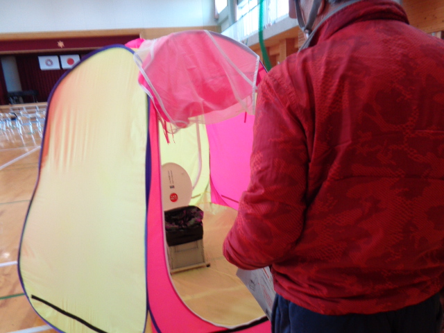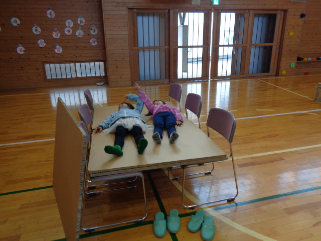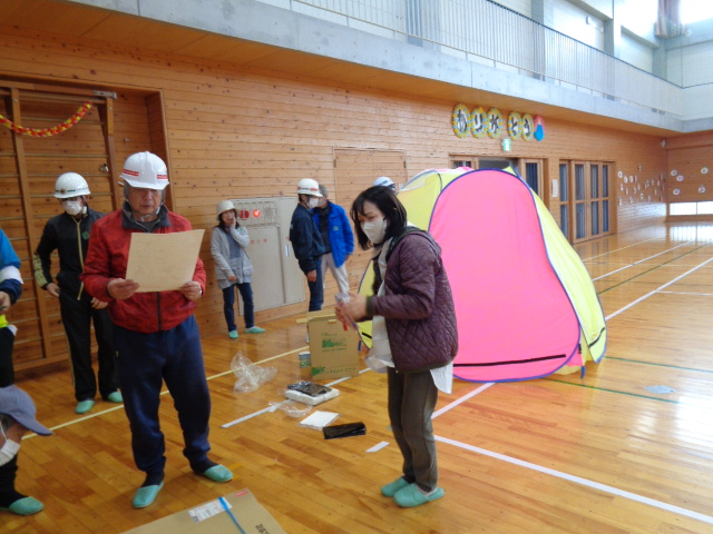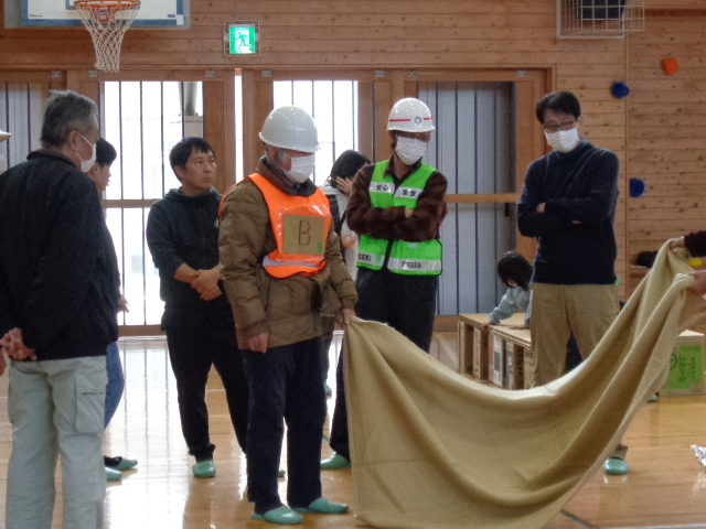 3月2日に行われた市災害時初動訓練のあとに、大井川東小学区地域防災連絡会が計画した活動が行われました。災害時には、地域が力を合わせて助け合う体制を作っているこの会では、今回、いつでも、誰でも、どこに何があって、どのように使うかを知ろうということで、防災備蓄倉庫に入っているものを確認しました。体育館と外に倉庫があり、発電機や投光器、テント、トイレなどが入っています。段ボールベッドなどを作り、寝心地を確認したり、毛布で簡易担架を作ってみたりしました。災害は起きないことが一番ですが、いざという時の備えを確認できました。東小地区の地域の方々の意識の高さを感じました。