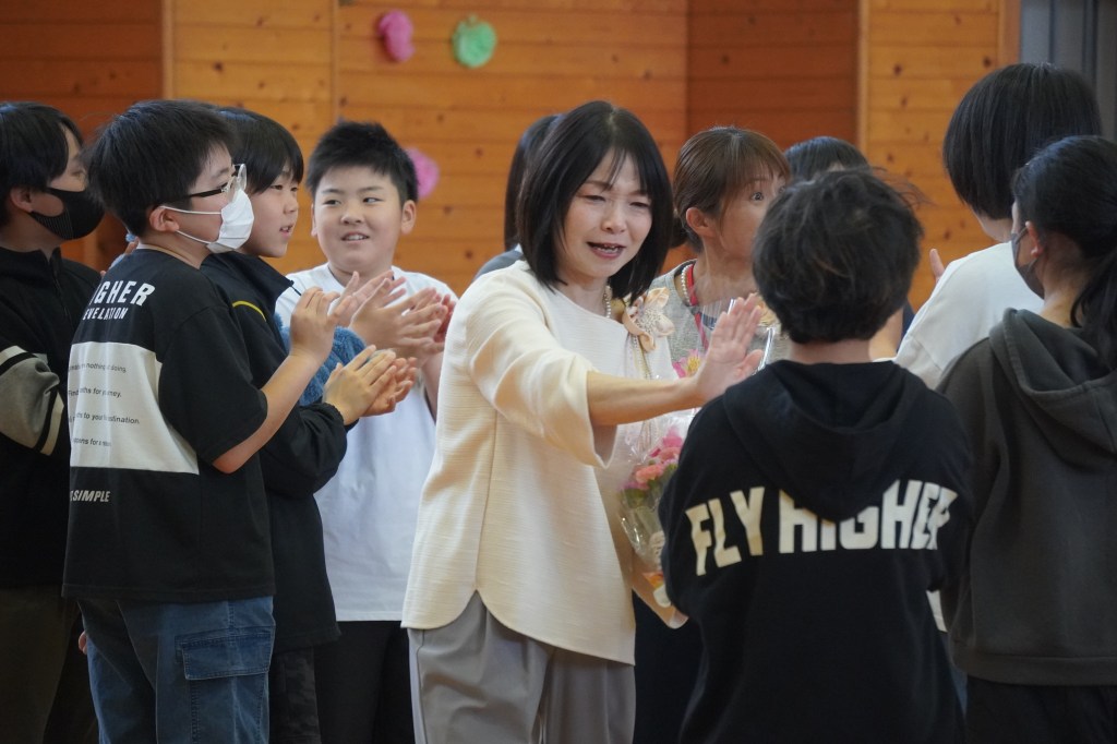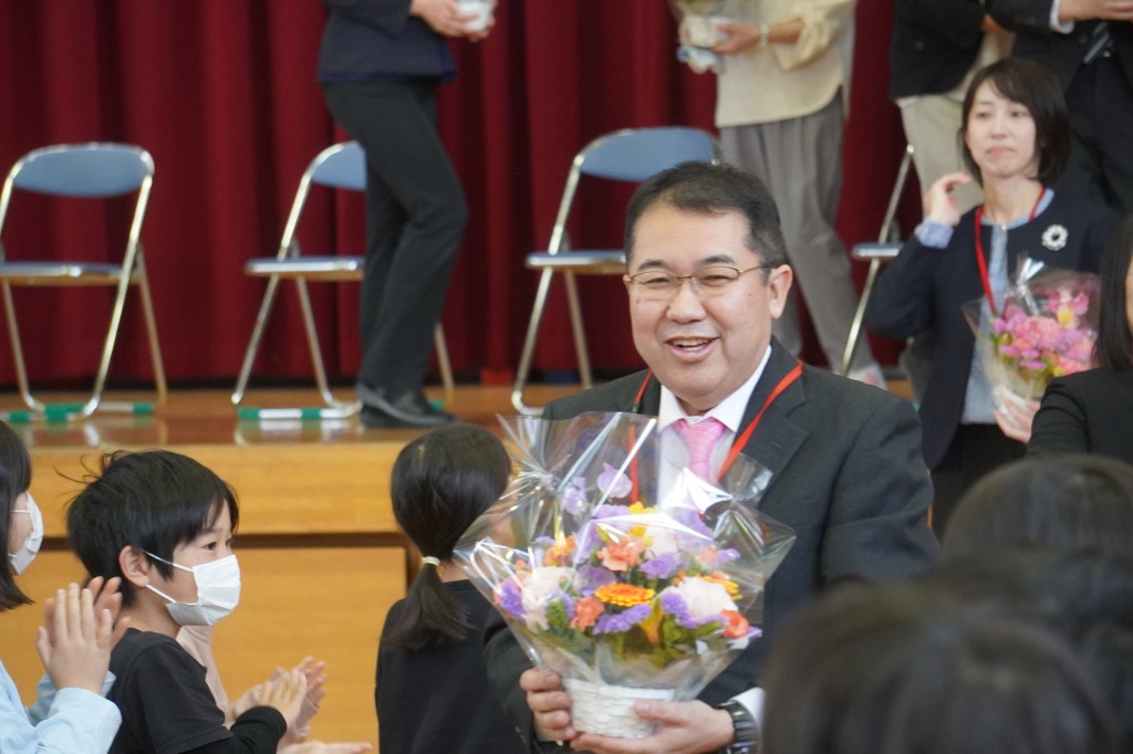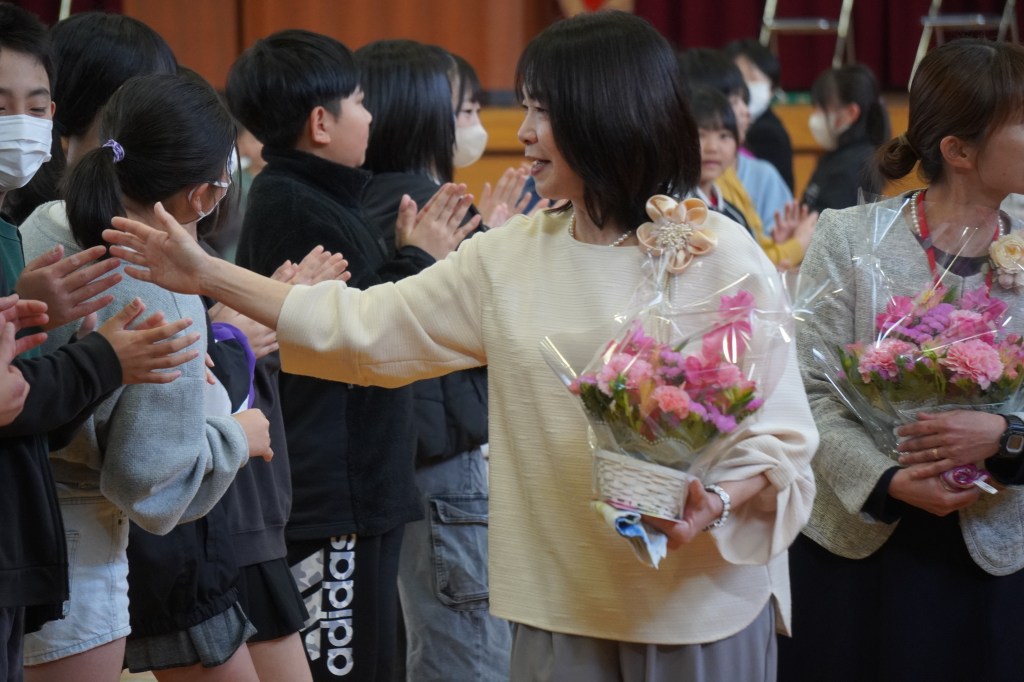 桜の花が咲き始めた大井川東小学校、春の気配とともに元気なしずはまっ子が久しぶりに学校に集まりました。今日は、離任式。これまでお世話になった先生方とのお別れに涙を流す子もいました。楽しかった思い出ととも、転退職される先生方も、しずはまっ子も、卒業生も新たな年度に向けて頑張っていきましょう。温かなしずはまっ子に囲まれた離任式でした。