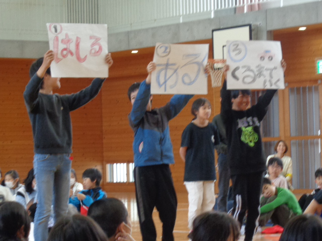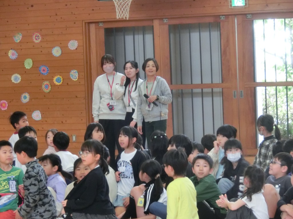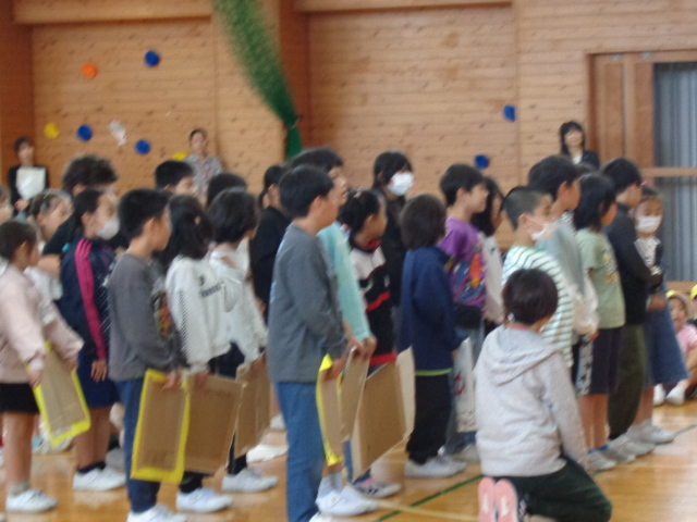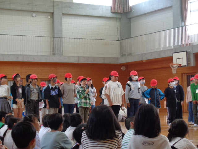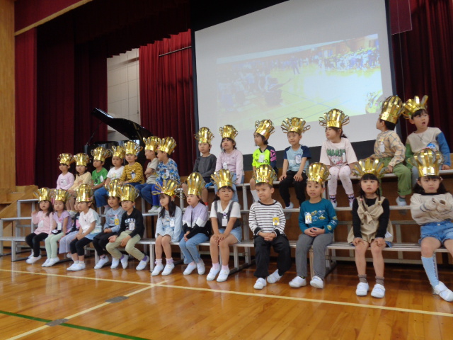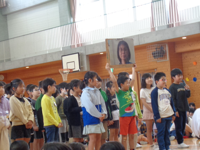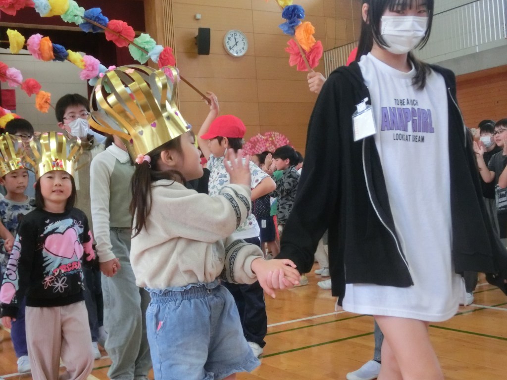 1年生の入学を全校児童でお祝いする会が行われました。虹の会や6年生が中心となって企画運営しました。各学年から学校生活が楽しくなるクイズなどが出され、1年生だけでなく、みんなで考え、楽しみました。1年生は6年生から贈られた王冠を被って、お礼に歌を贈ってくれました。1クラス28人と少なくなった1年生とは思えない、元気あふれる歌声でした。
