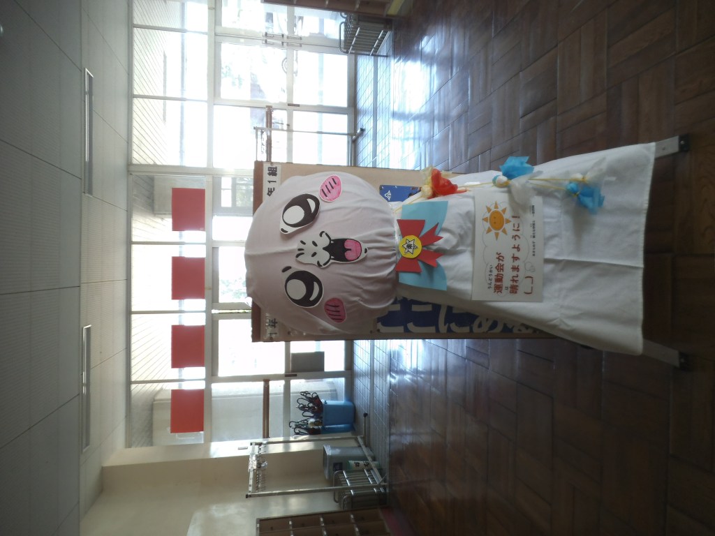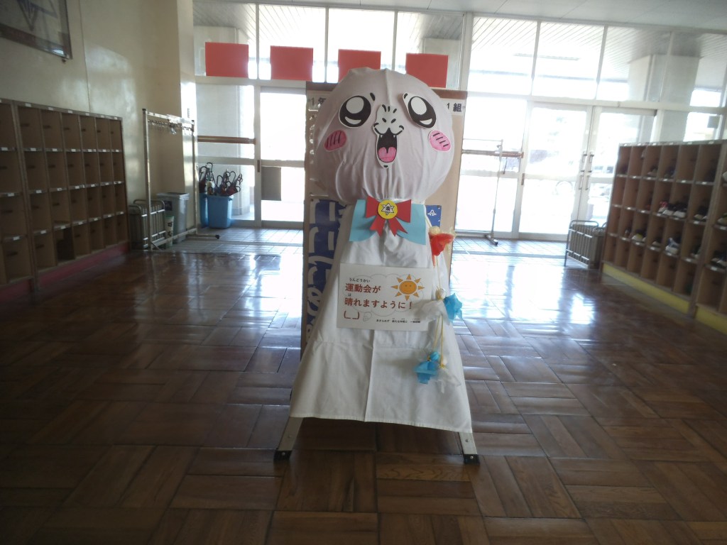 今週末に予定されている運動会の開催が心配される天気予報です。運動会当日は、子どもたちが気持ちよく競技ができるようにと、事務室の先生方がてるてる坊主を作ってくれました。月曜日から登場したてるてる坊主は毎日表情を変えます。子どもたちは毎日なでてて、天気を祈っています。
