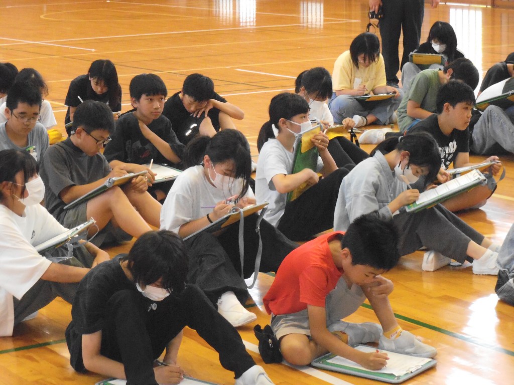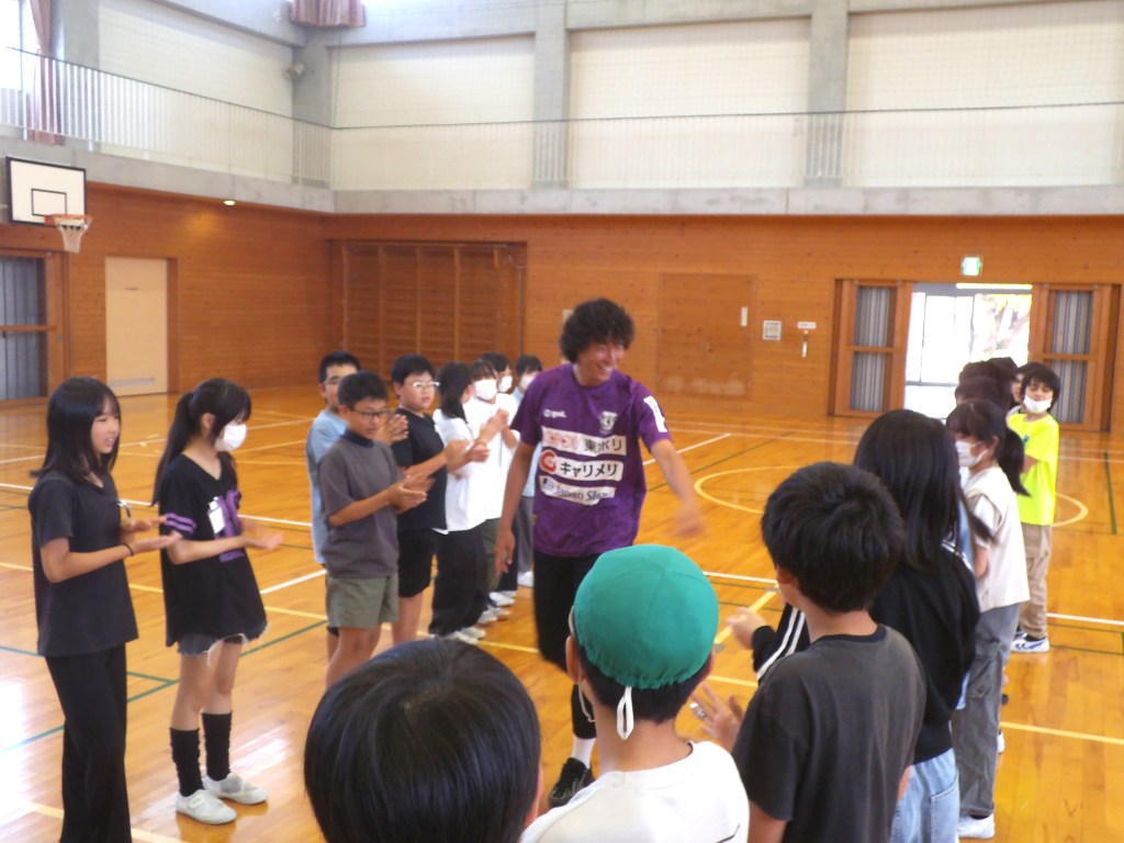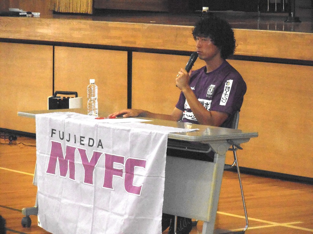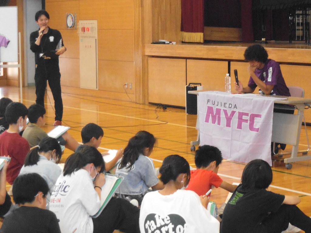 6年生は総合的な学習の時間にキャリア教育について学び、自分の将来について考えています。その中で、多くの職業人と直接触れ合うことで改めて、自分の夢を振り返るようにしています。本日は、藤枝MFCで活躍している中川選手をお招きして、今に至るまでの道のりや努力をお話いただきました。