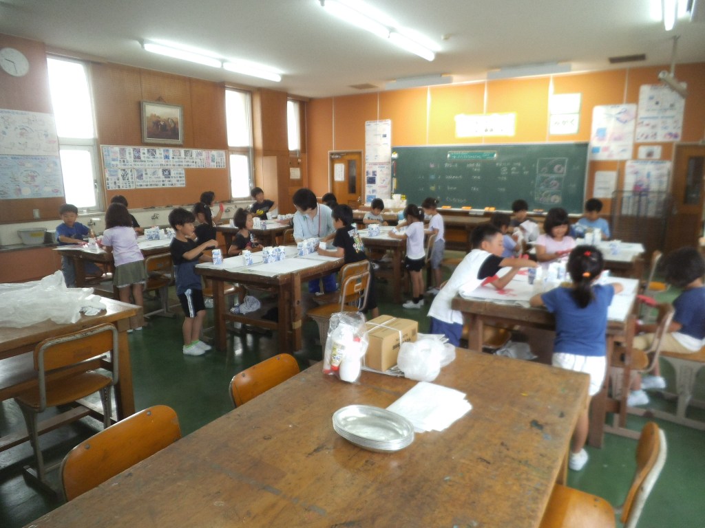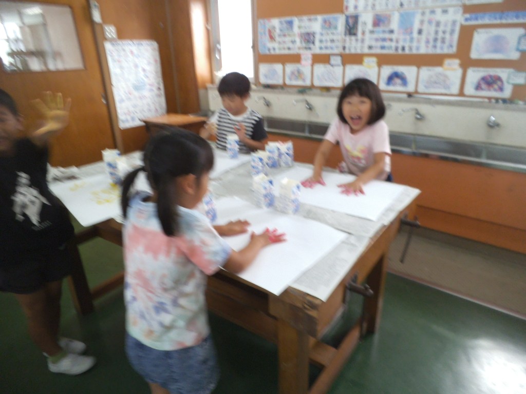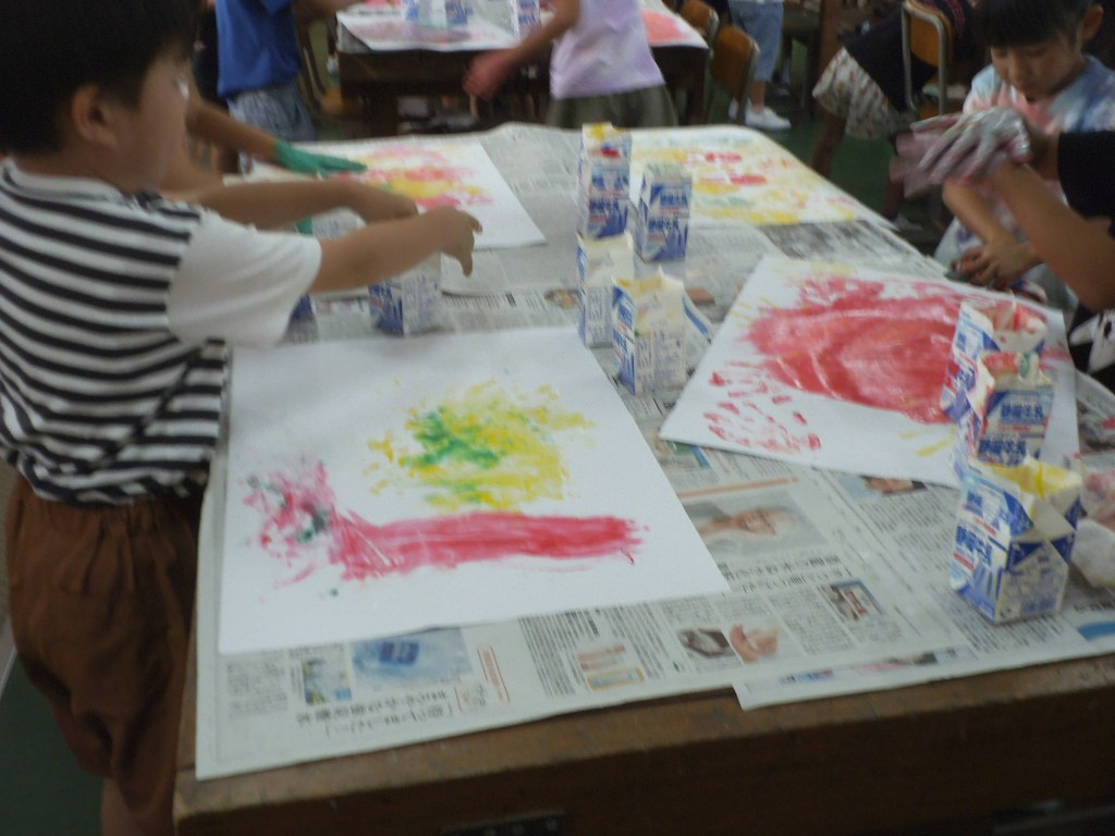 とろとろ絵の具を使って、自由に模様描きをしました。ボンドに絵の具を混ぜて、とろとろした感触を楽しみながら、混ぜると色が変わること、指や手のひらによって模様が変わること、色々な変化を楽しみながら、画用紙いっぱいに描いて行きました。はじめは、どんな感触なのか、恐る恐る触っていた子たちも、だんだん面白くなったのか、大胆な動きに変わって行きました。