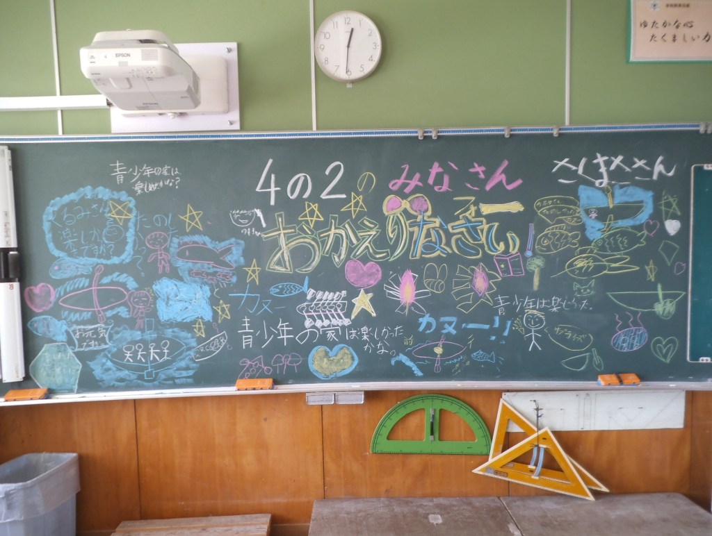 秋晴れの中、4年生がしおかぜ教室を体験してきました。学校を離れた学習の場で家の人と離れた1泊日の宿泊体験で子どもたちは多くの体験をし、自分たちで考え、行動する力を伸ばしてきました。テレビもゲームもない自然の中で、友達と過ごす充実感も得ることができました。ディスカバリーパーク焼津天文科学館では、天体望遠鏡からのぞく宇宙に感動したり、科学遊びを楽しんだりしました。焼津青少年の家では、カヌー体験、大漁ハイクなどを体験し、友達と協力しながら成し遂げることの大切さも学ぶことができました。学校では4年生の帰りを待つしずはまっ子がおかえり黒板を仕上げていました。