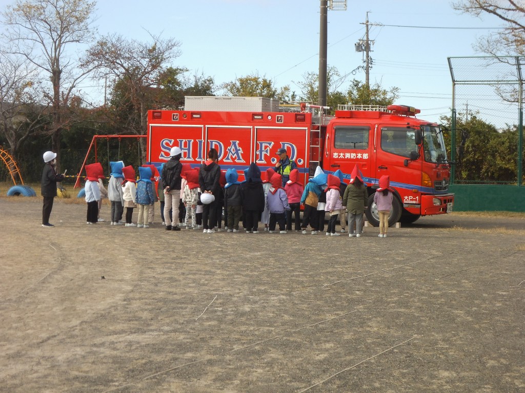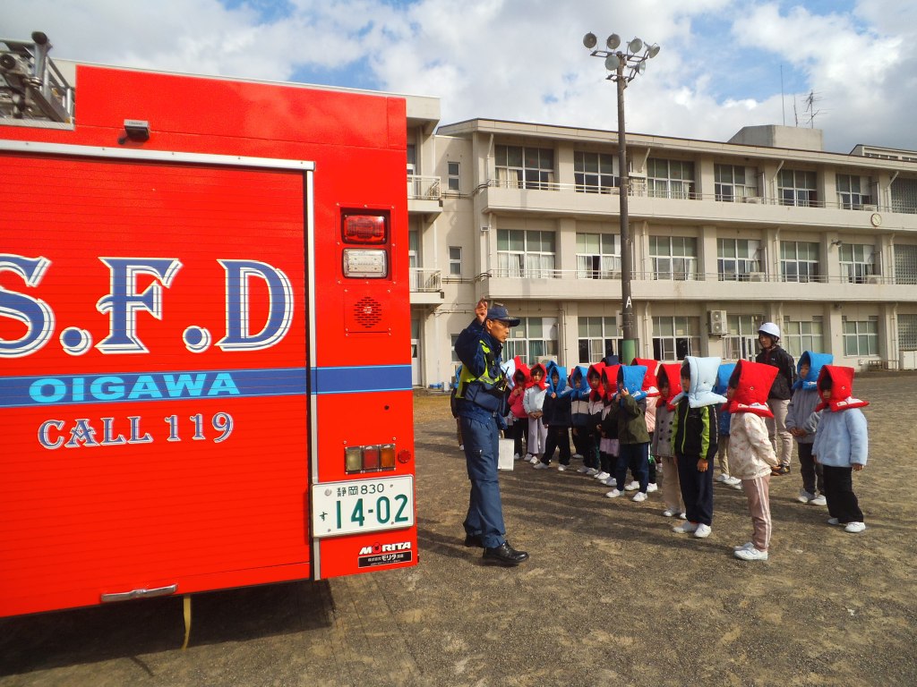 理科室から火災が発生したことを想定した訓練を行いました。大井川分署の職員の方々にも協力をいただきました。発災から避難まで6分40秒かかりましたが、集まった子供たちは先生たちの指示にしたがって整列をし、静かに待ったため、確実な人員点呼ができました。次に消防車の見学、非常時救助袋からの脱出体験などを行いました。5,6年生は3階から救助袋を滑って地上に逃げる体験をしましたが、とても落ち着いて行動することができました。