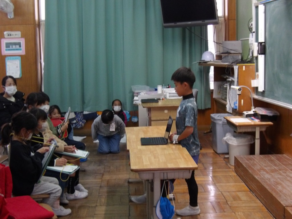 毎年、開催されているしずはま発表会の1日め。今日は、1年生、3年生、4年生の発表がありました。1年生は生活科で制作した秋の宝物を使った遊びを来てくださった方に紹介したり、一緒に遊んだりしました。3年生、4年生はしずはま(総合的な学習の時間)の学習のまとめを発表しました。ICTを活用してスライドにまとめたり、画用紙を使ってクイズを作ったり、聞いている人がわかりやすく、楽しくなるような発表をしていました。